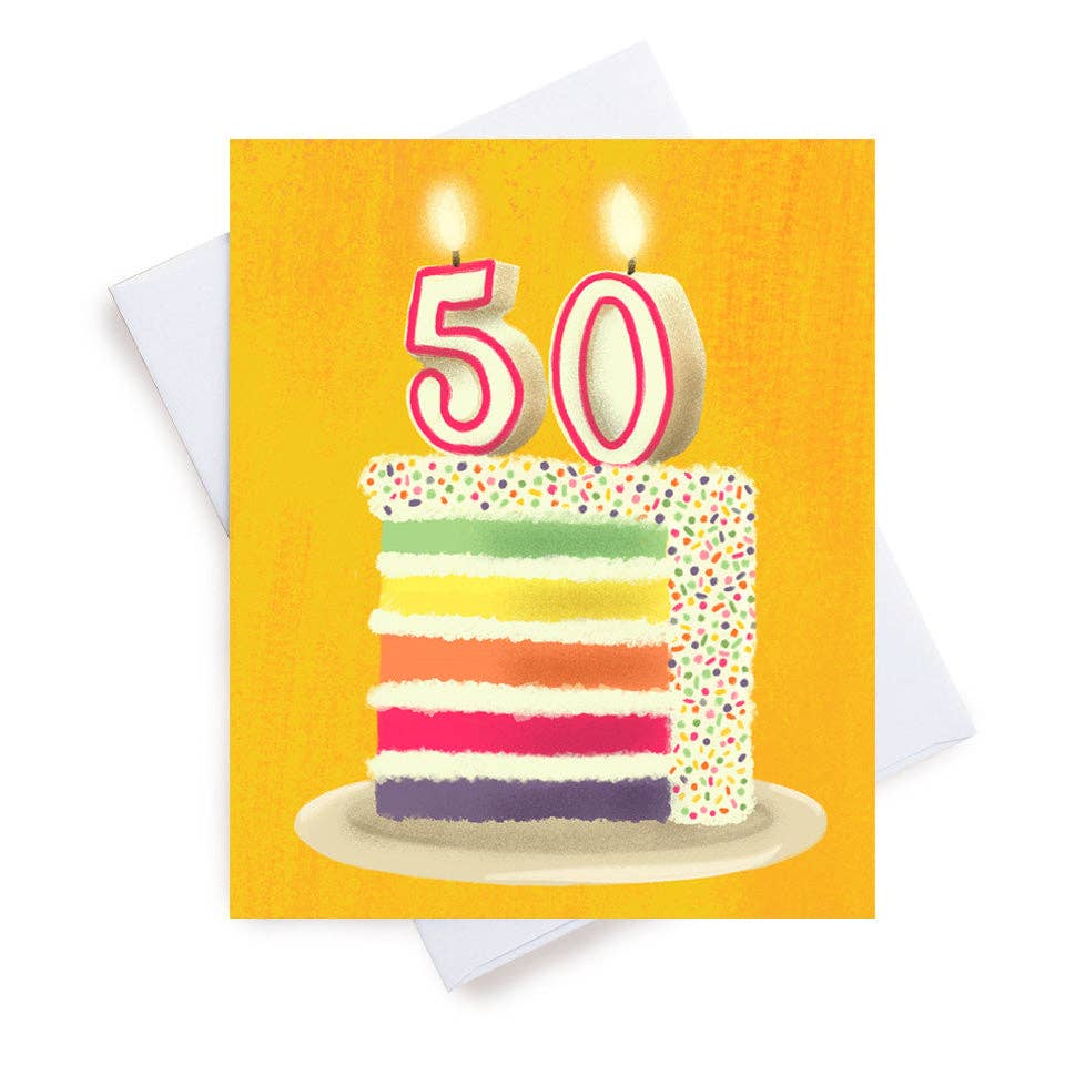 Celebrate the big 7-0 with a vibrant, colorful card featuring the number "70" crafted from candles atop a seven-layer cake in all the brightest colors! This cheerful design is perfect for making a milestone birthday extra special. Each card begins as a hand-painted gouache illustration, creating a unique and memorable keepsake for the birthday person who's truly one-of-a-kind! Product Description: 4.25” x 5.5 “ Folded greeting card. Created in my home studio in Halifax, Nova Scotia. Blank inside for optimum room to say what you gotta say. Envelope and eco friendly plastic sleeve included. Printed in small batches at a local shop in Halifax, Nova Scotia on sustainable paper. Hand packaged and shipped from my home to you.