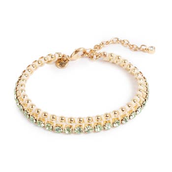 The Teal Tides bracelet is a twist on your classic tennis bracelet. This bracelet reminds us of those beautiful turquoise crystal clear waters. Featuring brand new crystal colors with glimmering flecks of serene blues. All crystals are hand-set. This stackable bracelet is a must have. Measures: 6.25" up to 7.5" or larger length option with 2 additonal crystals measures 7.75" up to 8" Stones measure: 6 mm & 8 - 8.3 mm each Available in silver finish or 14k gold plated over brass Arrives in a white microfiber snap pouch with katora logo