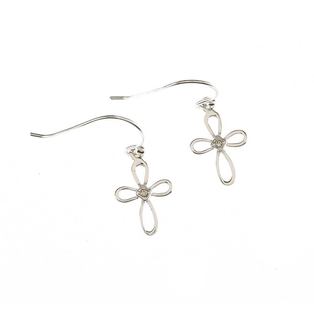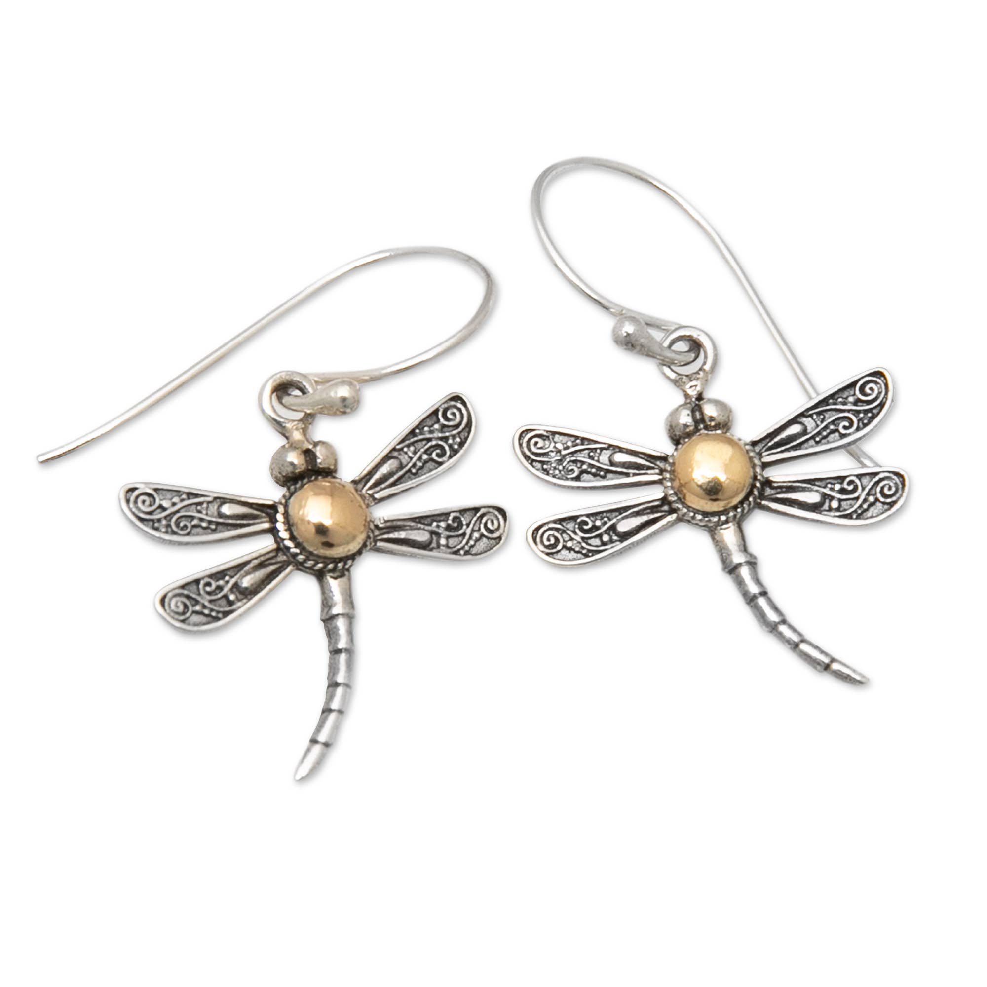Our Dangling Dragonfly Earring With Crystal features solid brass, with an antique silver finish. Embellished with genuine Swarovski Austrian crystal for a touch of sparkle and Sterling Silver wires. Dragonfly measures 3/4" wide. 1 1/2" earring length.