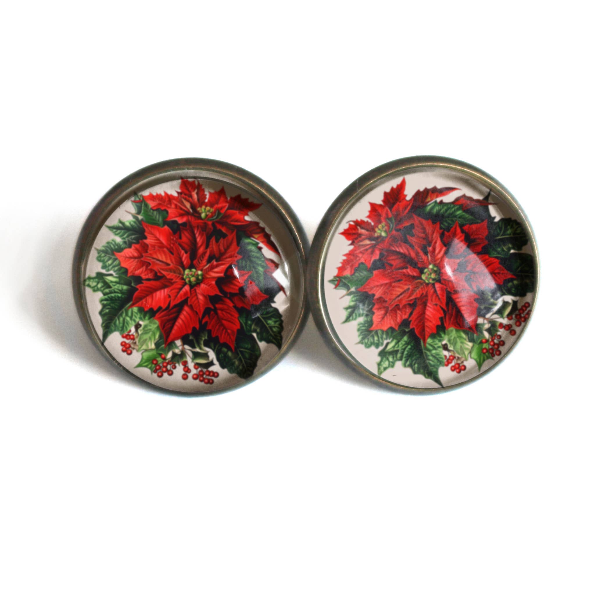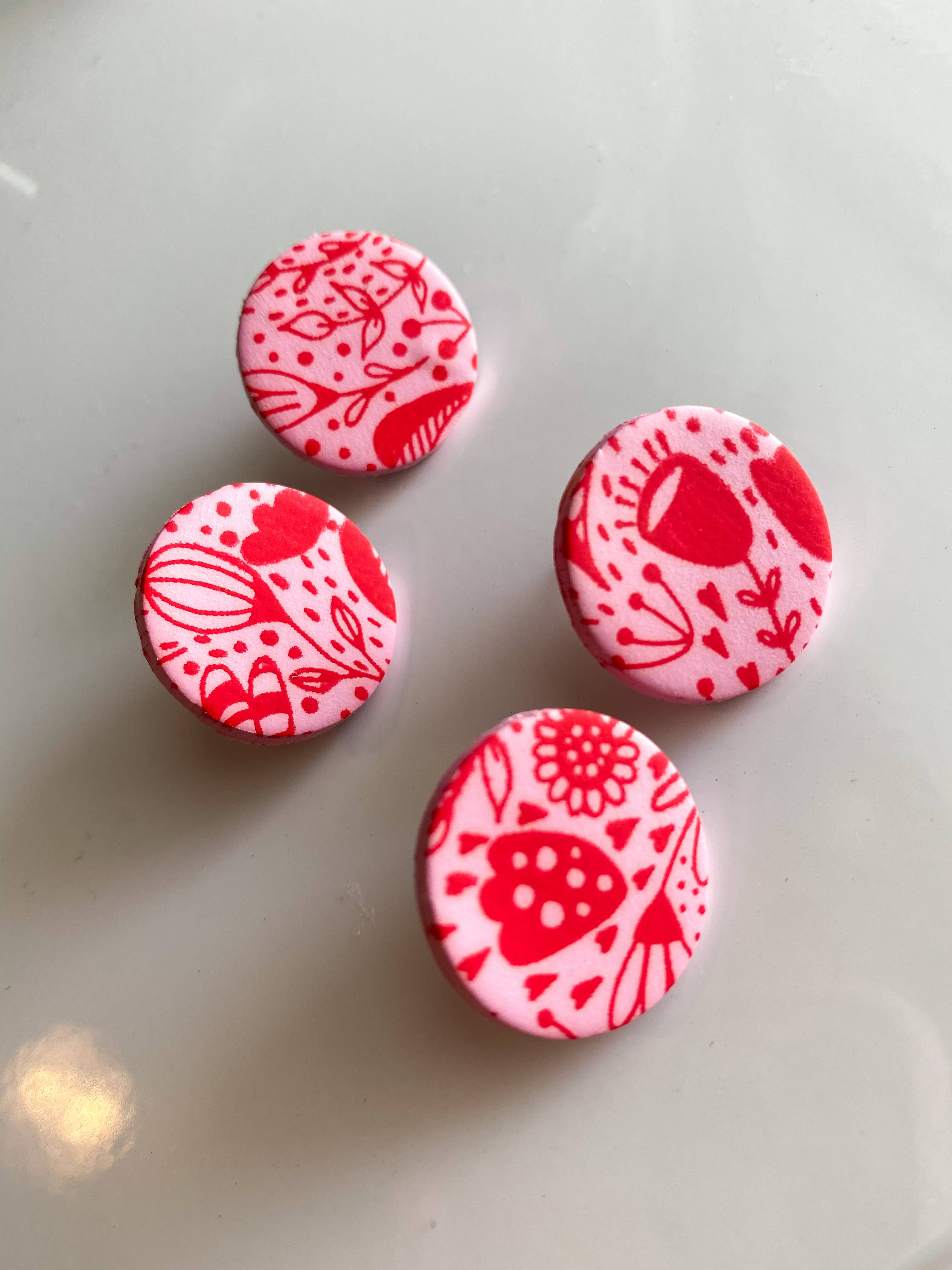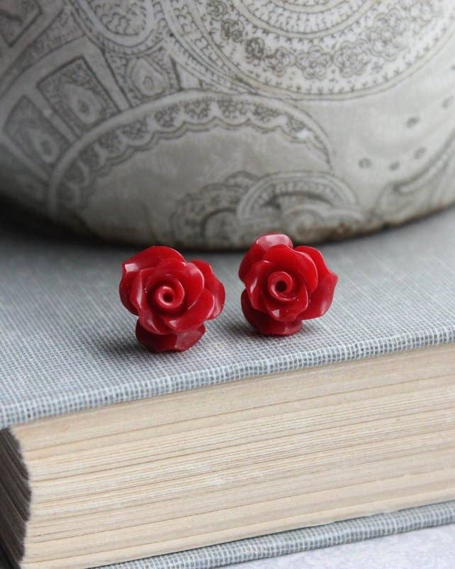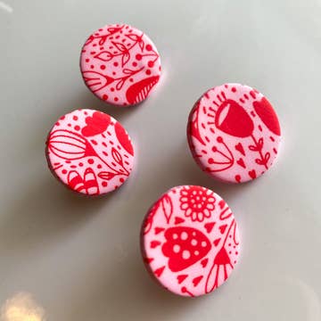 Red and white stud earrings with a darling Nordic style pattern. Each measures about 12x18mm and are made with vintage lucite - a plastic made popular during the middle of the last century. Hand-set with surgical steel posts. Most all earrings are made with vintage lucite parts that were made in Rhode Island in the 1960's - early 80's by Best Plastics. We hand-set them with surgical steel earring posts and they have sturdy surgical steel/acrylic backings on them as well. Light-weight & fun to wear.