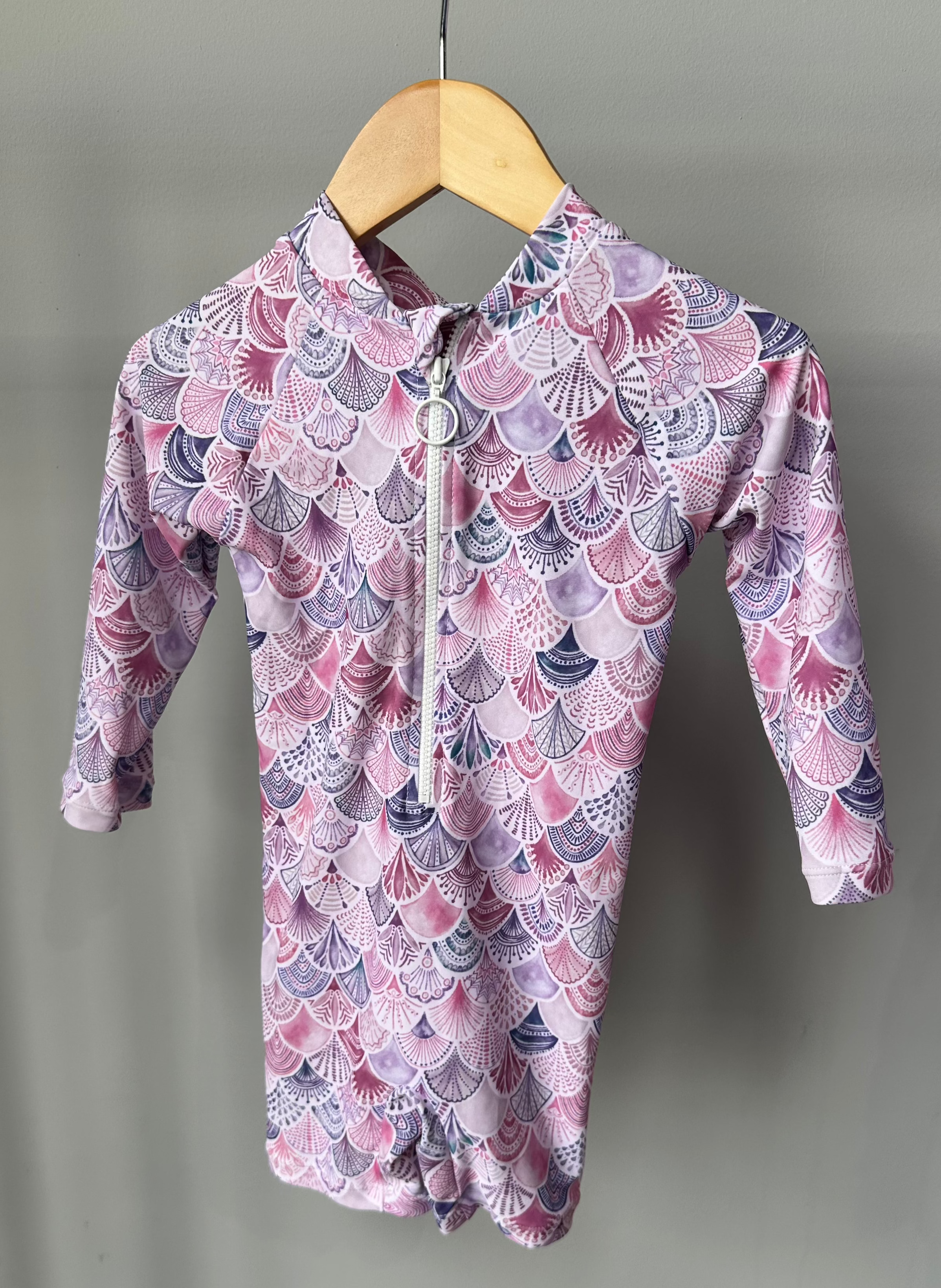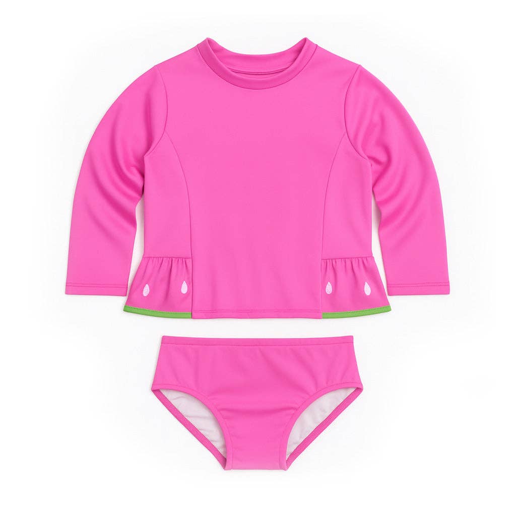 Our Ruffle Rashguard swimsuits offer full Chemical Free UPF 50+ Protection in the sweetest design around. The body of our suits are fully lined for modesty with an ultra soft liner, and the arms are left unlined to ensure full mobility. The shell of the suit is made from our ultra soft + breathable Lycra fabric providing 4-way stretch for all day comfort and play. Our unique keyhole neck design easily unties to create a wide opening to easily put on and remove the suit (even when wet!). The tie of the neck empowers little hands to tie and untie themselves, ensuring bathroom breaks are a breeze. To finish the suit off, we added a subtle hip ruffle detail for a touch of sweetness and added sun protection.