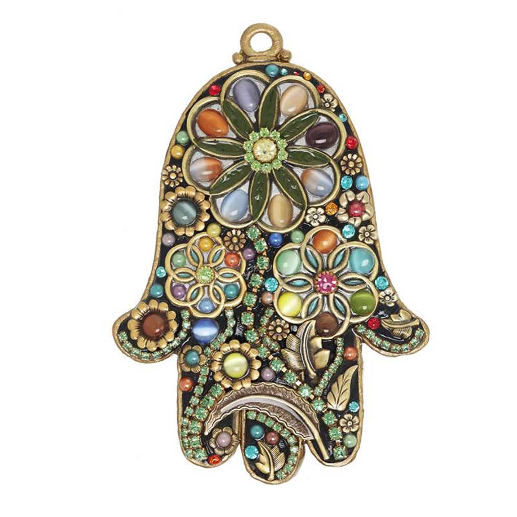 Pacific Opal Swarovski Crystals and Cats Eye stones give this Hamsa a luminous glow. One of our most popular styles, this hamsa makes a great wedding our housewarming gift. The Hamsa is a symbol of good luck meant to ward of negative energy, this versatile symbol can be displayed and worn by all. | Materials: Cats Eye, Swarovski Crystal |Metal: 24K gold electroplated over brass and white metal | Size: 4.5 inches long | Handmade in NYC studio | Complimentary gift wrapping
