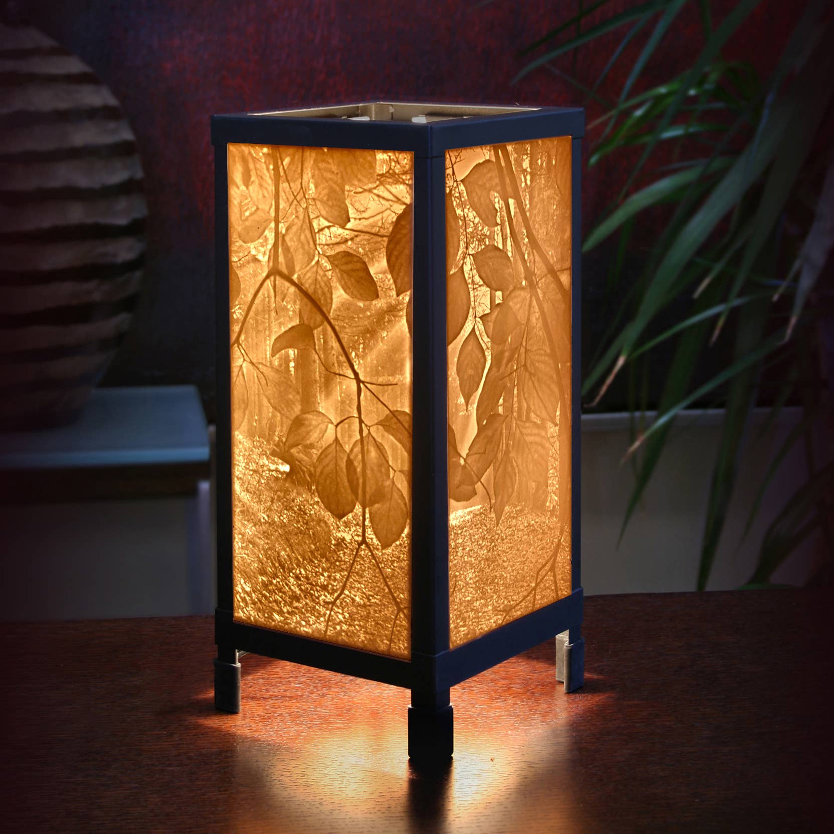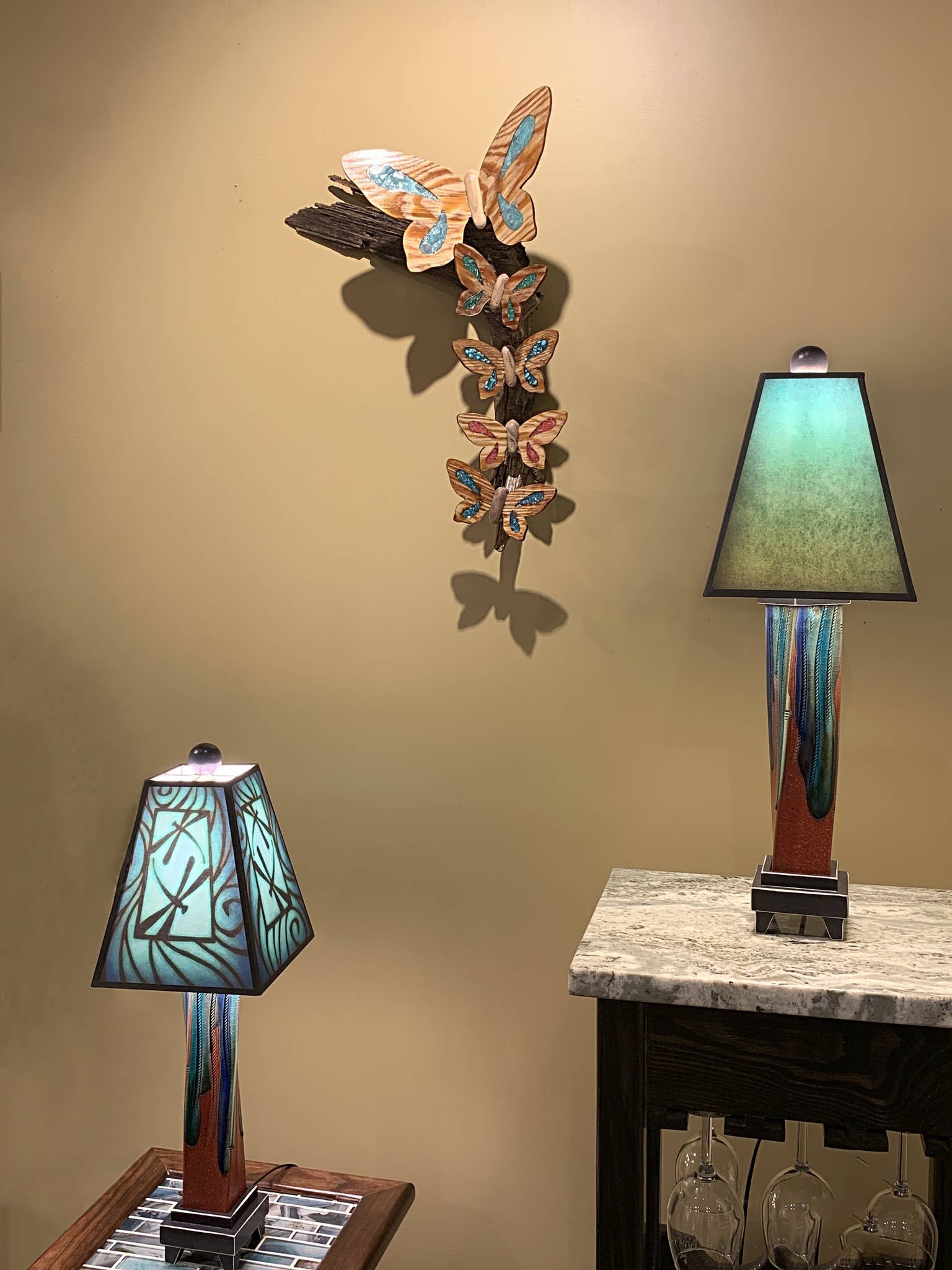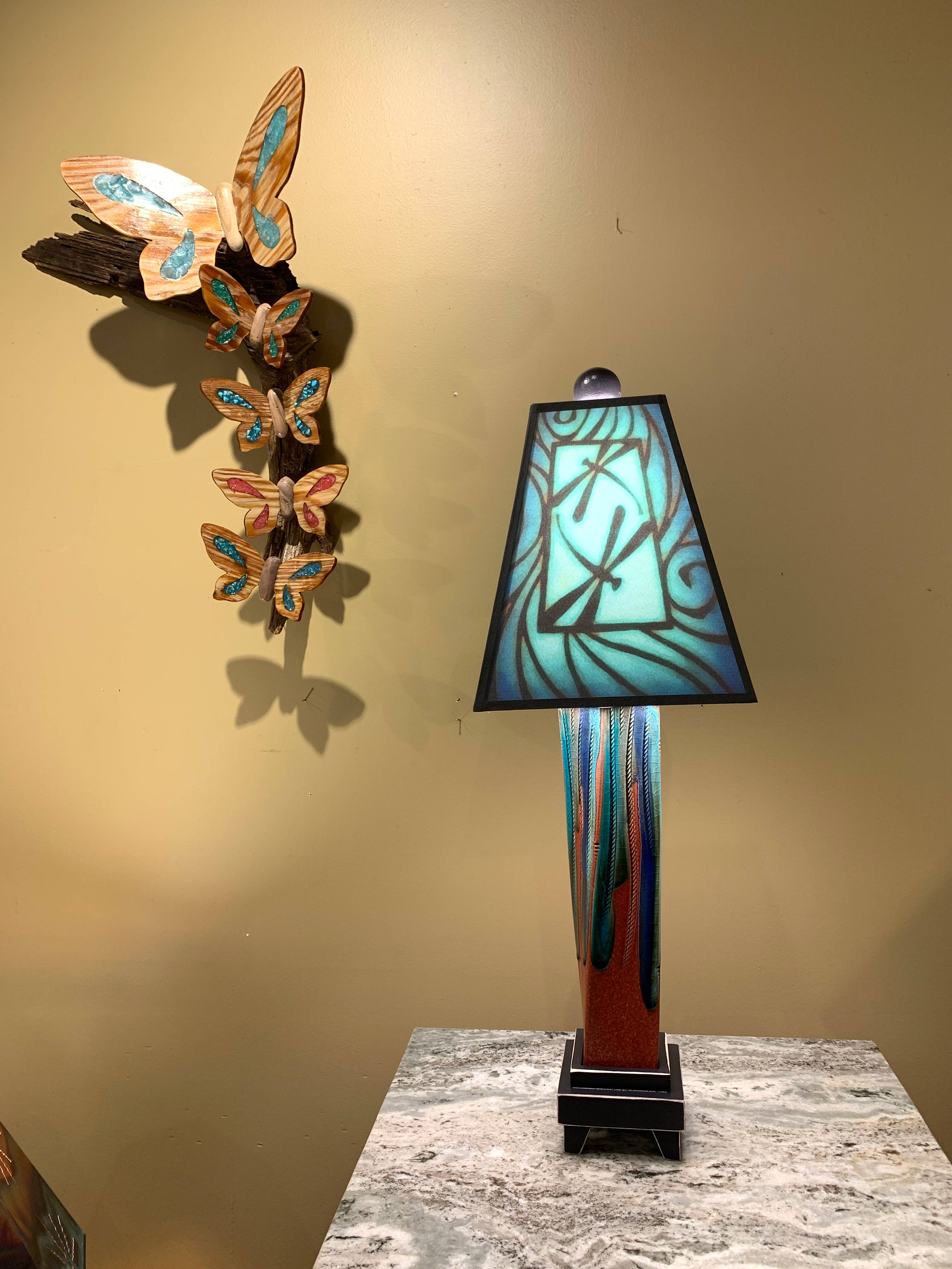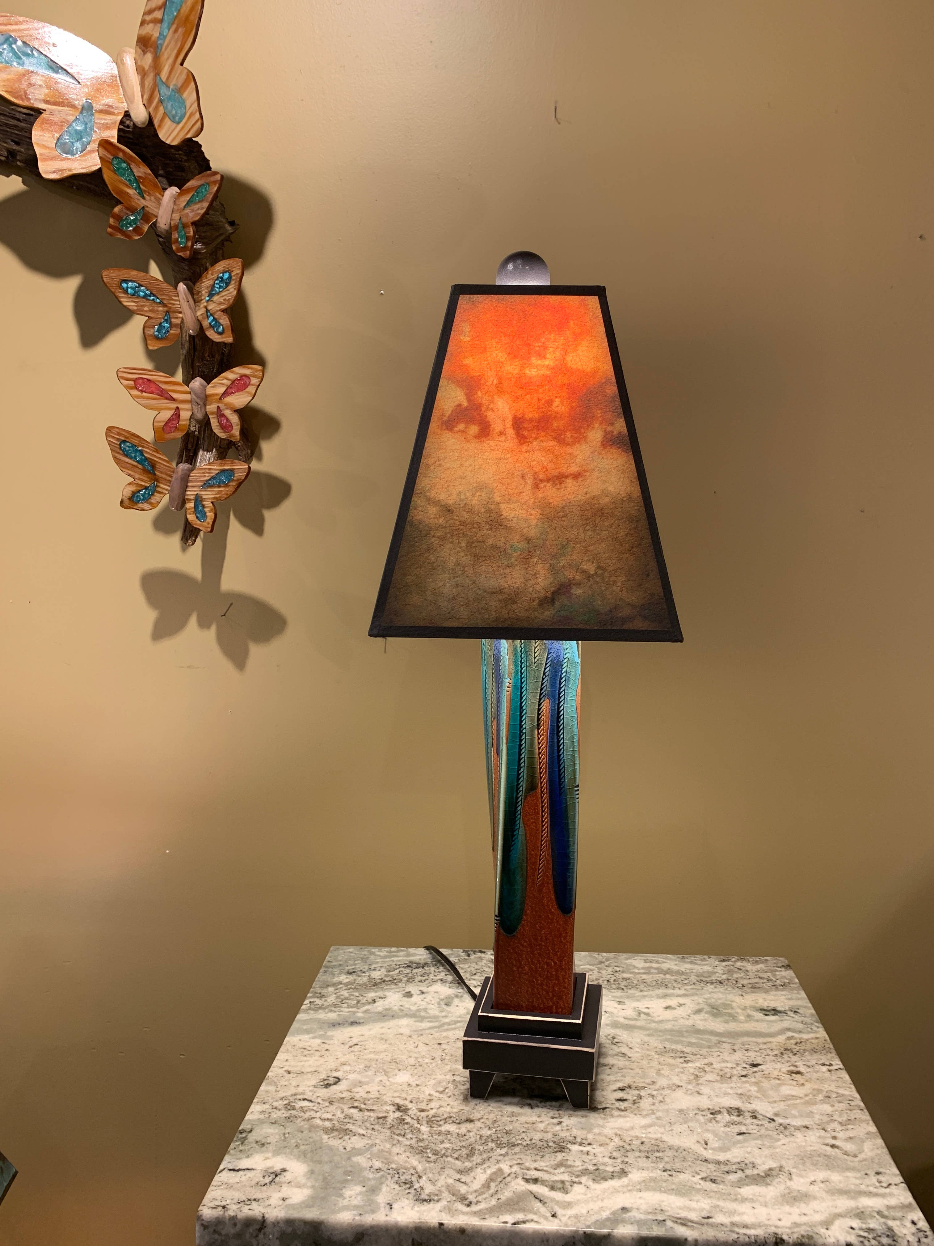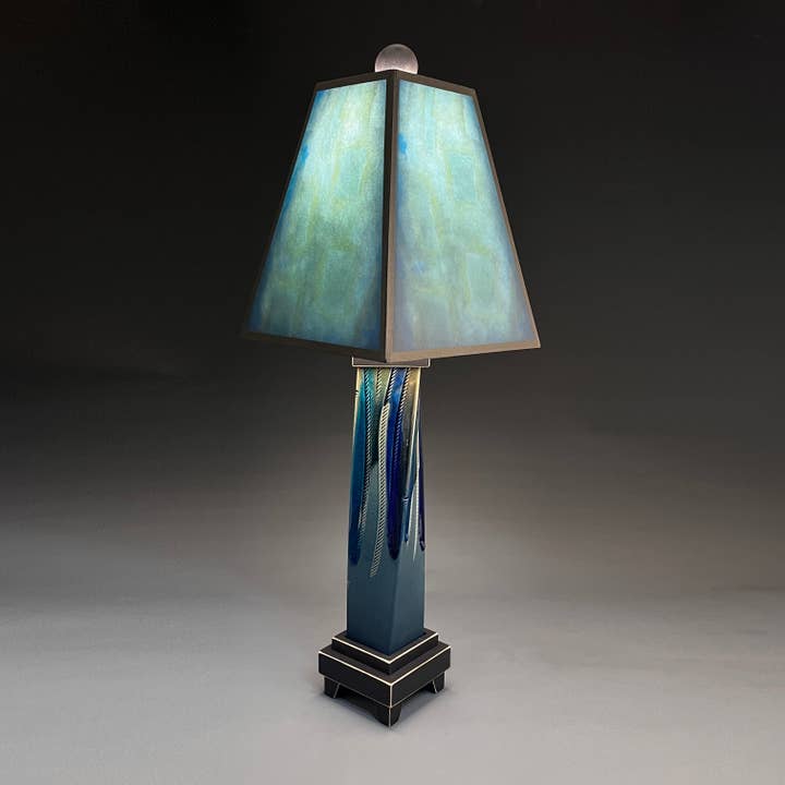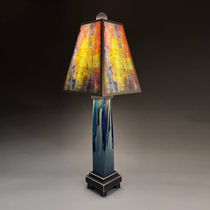 Extruded Lamps - 8" x 8" x 25". We melt glass over an extruded clay vase that is held by a distressed wood base. We make the shades from Michael's art which is printed on heavy archival art paper and UV coated to last a lifetime without fading.