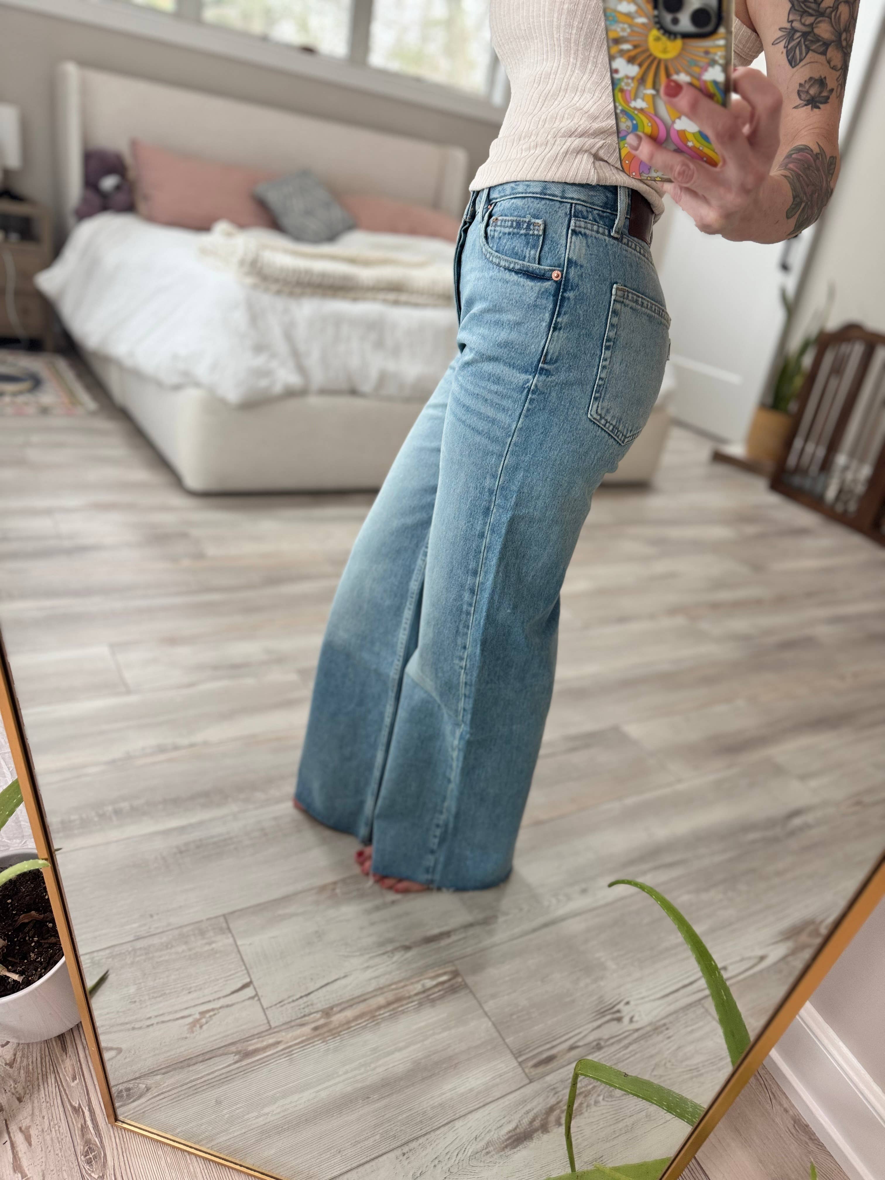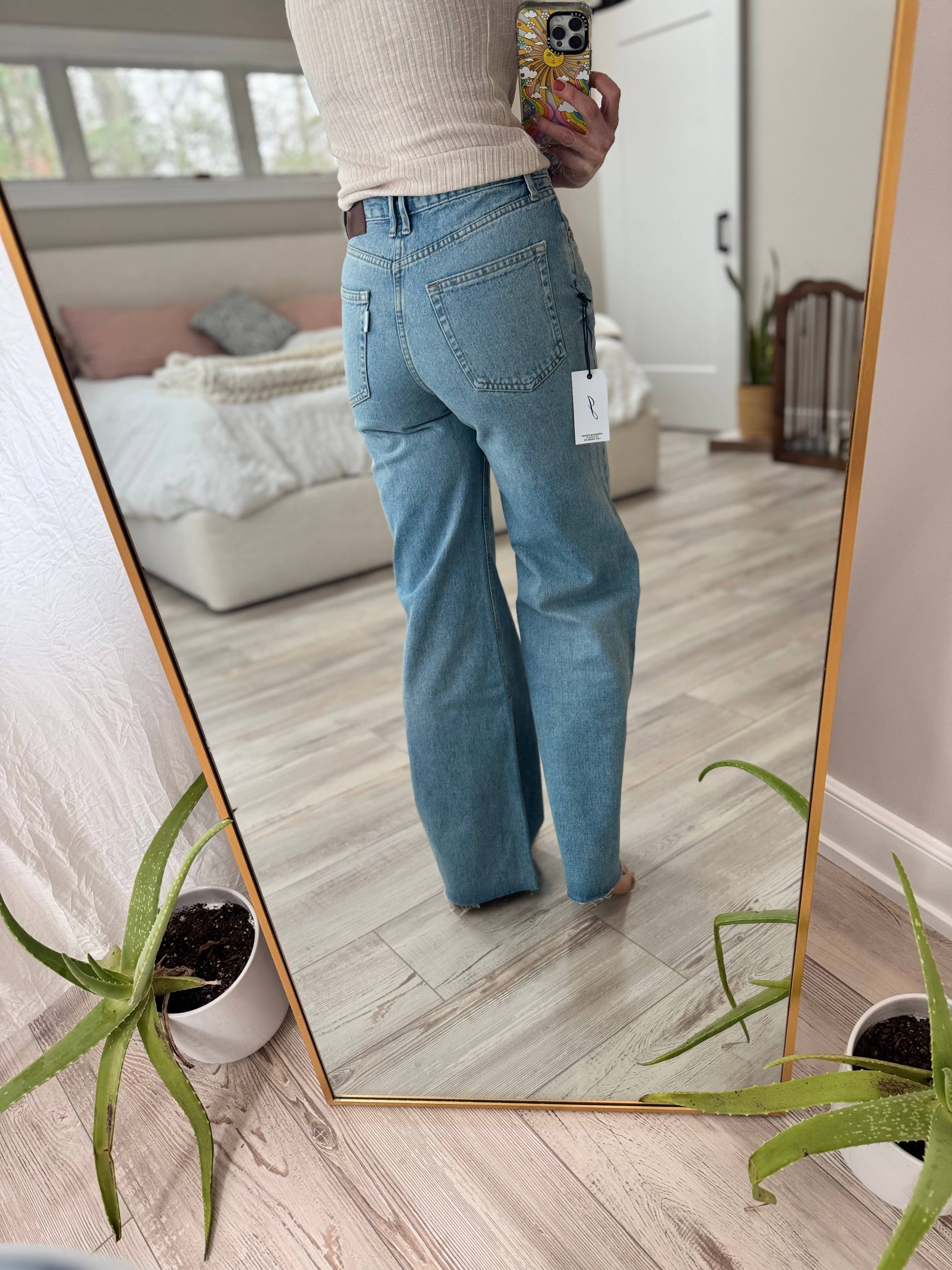 Inspired by the edgy, dare-to-be-different attitude of the '90s, The Beach-to-Bar pant is a high-rise wide leg baggy fit for a perfectly flattering silhouette for both day to night. This pant is constructed in a super soft 100% Cotton denim with a vintage inspired light wash & scissor cut hem. This jean is for all "it-girls" that want a go-to pant that is both for the beach, but also for the bar.