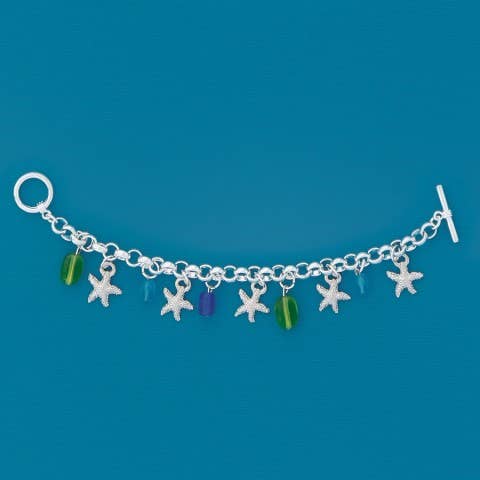 Our "Shells" Multi Charm Bracelet features several different shell charms. Bracelet is silver plated with a belcher style chain with toggle and ring clasp. Bracelet is approx. 8" long and comes in a polybag. The perfect jewelry accessory for those who love the beach!