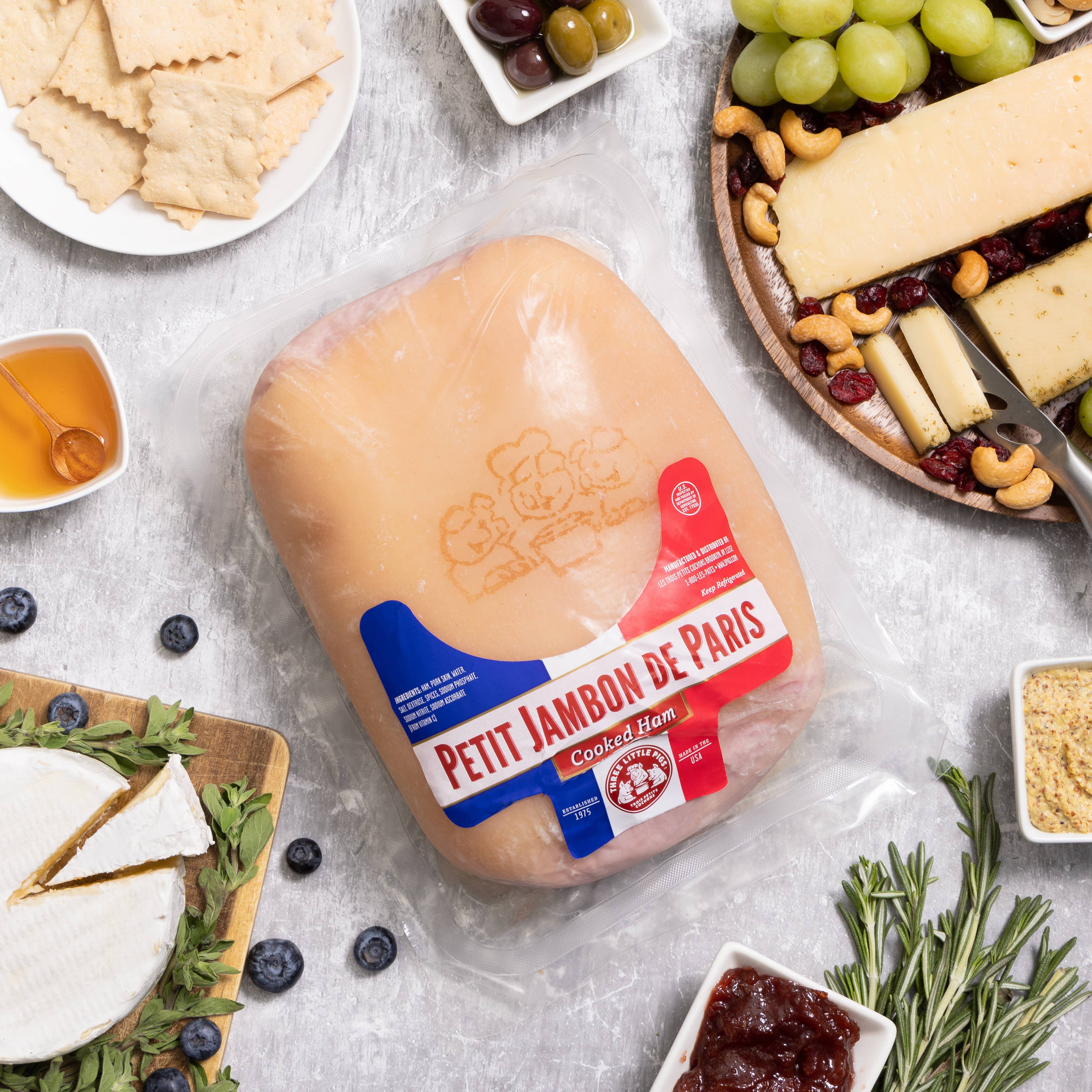 Our Jambon de Paris is made according to the traditional French recipe to ensure a rich, delicate taste. This whole muscle ham is slowly cooked in its own juices, low salt, very lean, low-fat whole-muscle pork is carefully seasoned and perfect for slicing. Enjoy one of the best Parisian-style hams available in your favorite sandwiches, croque monsieur, quiches, party trays, antipasto platters, appetizers, and breakfast dishes. * Size: ~11 lbs or Petit Jambon de Paris ~6lbs * Fully Cooked * Gluten-Free * Keep refrigerated Ingredients: Ham, Pork Skin, Water, Salt, Dextrose, Spices, Sodium Phosphate, Sodium Nitrite, and Sodium Ascorbate (from vitamin C).