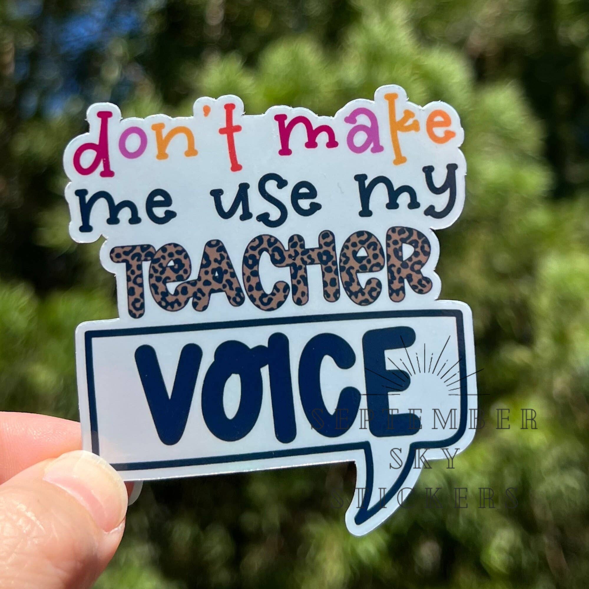 Everyone knows the teacher voice, probably the most terrifying thing on the planet. This vinyl sticker is a part of our Teacher Stickers Collection. Details: •2.9 x 3.04 inches • Printed and shipped with care from the U.S.A. • High quality and durable vinyl, indoor and outdoor use • Waterproof and weatherproof We are partnered with ActiveMinds.Org to help spread mental health awareness.