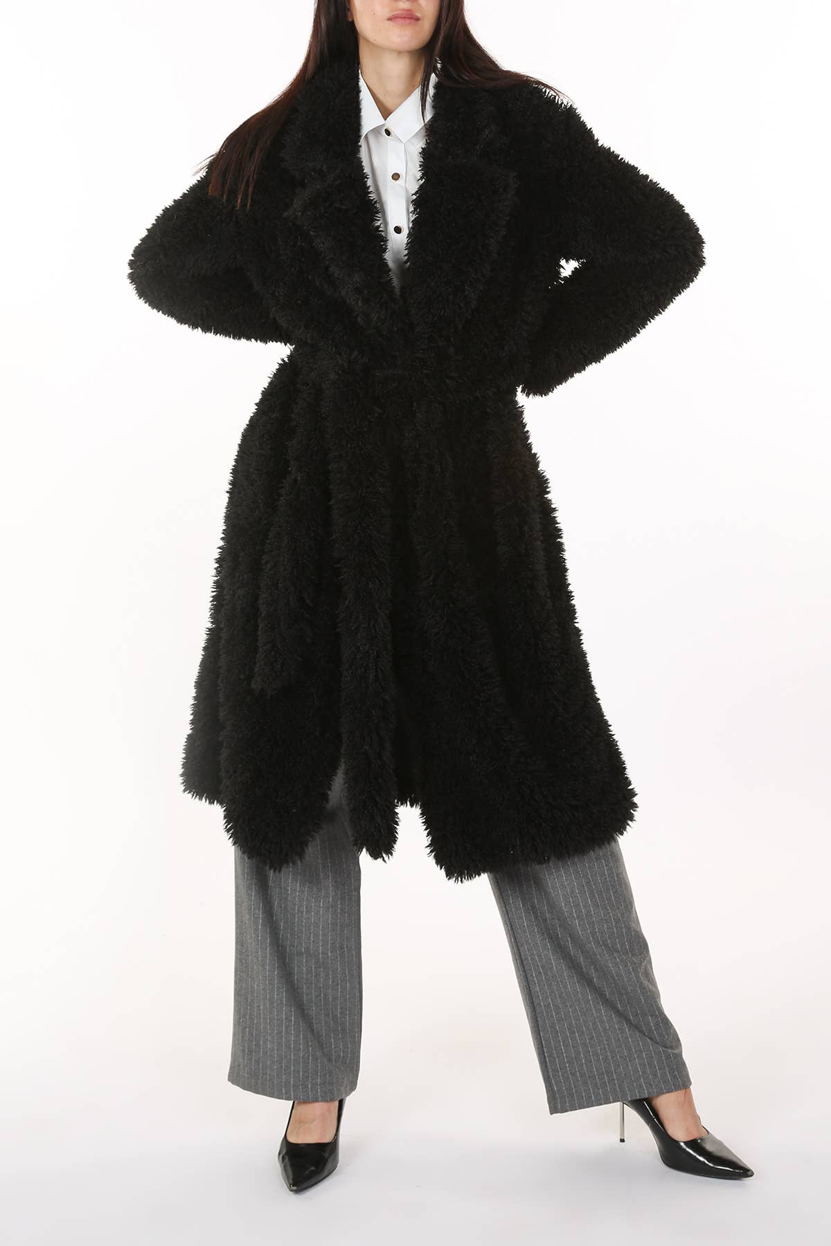 Sequined Fringe Detail Faux Coat Faux fur Sequined fringe details Hook & loop closure Long sleeves Pockets included Relaxed fit Imported Model is 5' 9" wearing ALL size Caring for your clothes is caring for the environment Wash your clothes with lower temperature and delicate spin cycles. It helps to maintain the color, shape and structure of the fabric. At the same time it reduces energy consumption that is used in care processes
