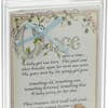 This unique Baby to Bride Bracelet Keepsake celebrates a girl's journey from infancy to her wedding day. The set includes a delicate sterling silver bracelet adorned with pearls and a lucky penny meant to be kept as a cherished memory. The bracelet is designed to be worn by the baby girl, symbolizing innocence and love, and the penny can be placed in her shoe as a heartfelt tradition when she becomes a bride. This keepsake comes framed with a beautifully handpainted poem that reflects the sentimental passage of time and the lasting bond of family. Quality Materials The bracelet is crafted from sterling silver and accented with lustrous pearls, ensuring a timeless and elegant piece. The lucky penny adds a symbolic charm to the keepsake. The framed card features delicate handpainted floral and vine designs, enhancing the overall quality and visual appeal. Use and Features Perfect for commemorating precious moments in a girl’s life, this keepsake serves as a meaningful gift for families to celebrate their children. It includes a space to personalize with the baby's name, making it a special heirloom passed down through generations. The accompanying poem and instructions add emotional value, making it an ideal memory holder for parents, grandparents, and loved ones.