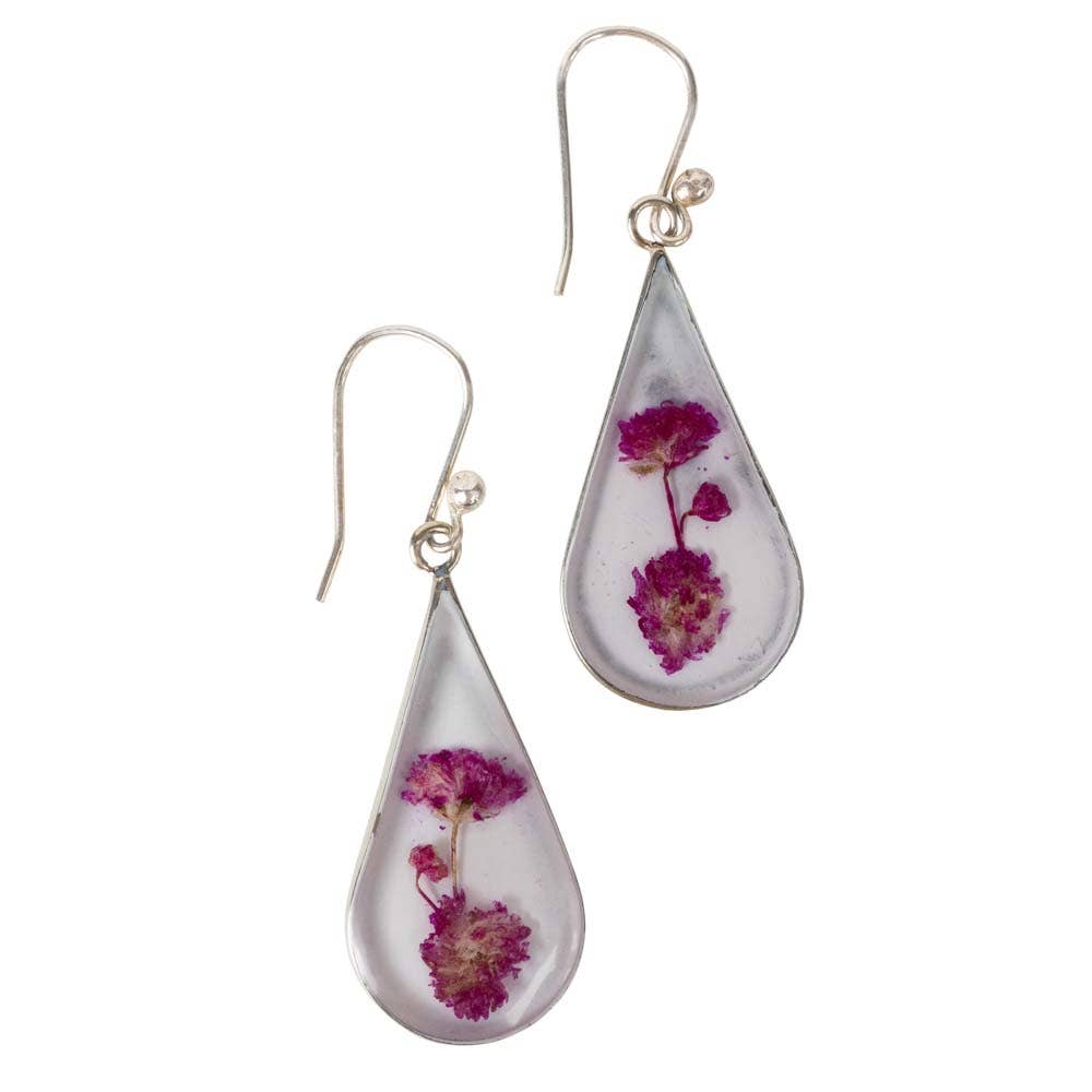 Bring home cottage style with genuine pressed flower jewelry! These delicate clear rectangular earrings feature dried red flowers and green leaves embedded in clear resin with a gold border. Natural and sweet vintage design with red genuine flowers. * Made in China * Genuine pressed flower earrings * Measures: 2" x 3/4" * Materials: Gold Tone Metal, Dried Flowers, Resin * *