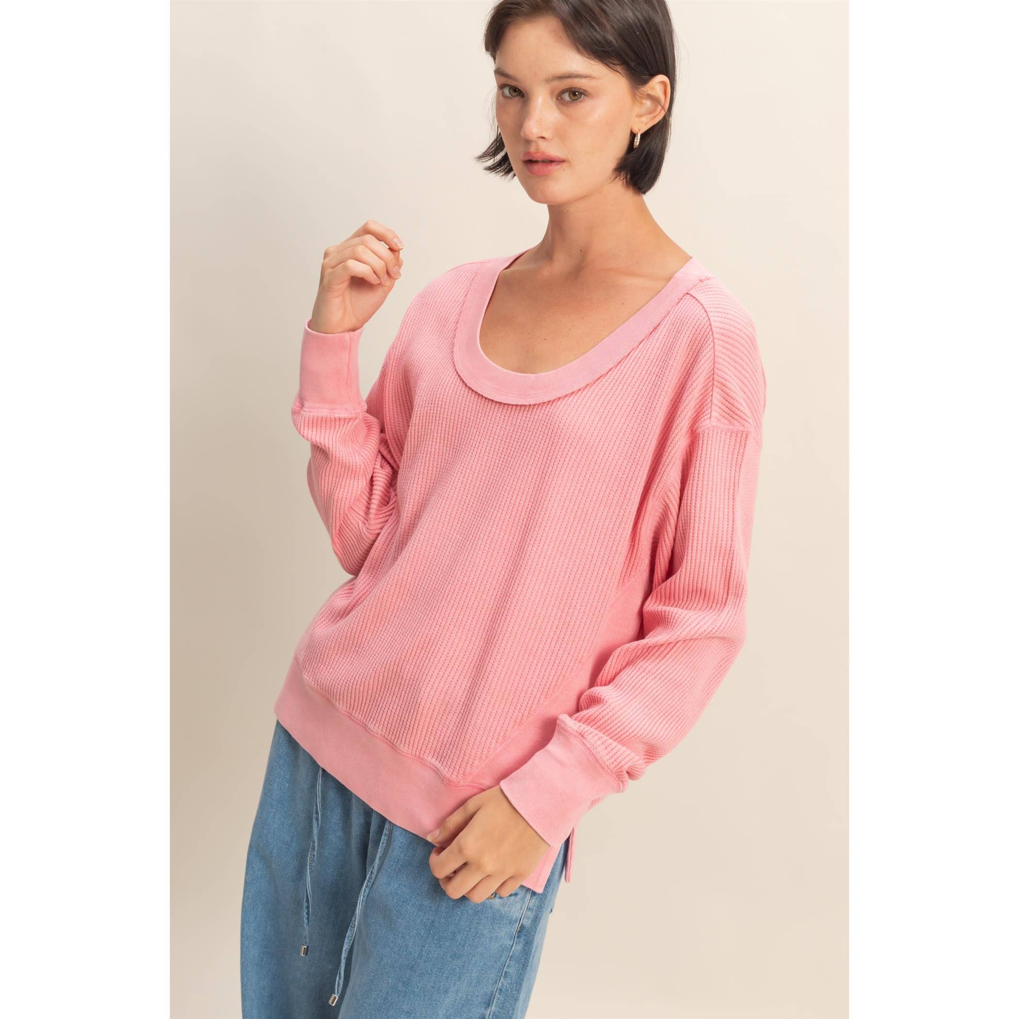 - Style No.: T0062 Soft, breathable, and quietly detailed-this pigment-washed V-neck top brings ease and edge together. It's relaxed but never ordinary. The kind of piece that slips on and instantly elevates your everyday. Features: - Pigment washed cotton fabric - Lightweight and breathable - Relaxed fit - Long sleeve top - Dropped shoulders - V-neck - Side slits - Pronounced seam details - Thumb holes details Model is 5'8" and wearing size Small. Fabric: 100% Cotton C.O.O: Import
