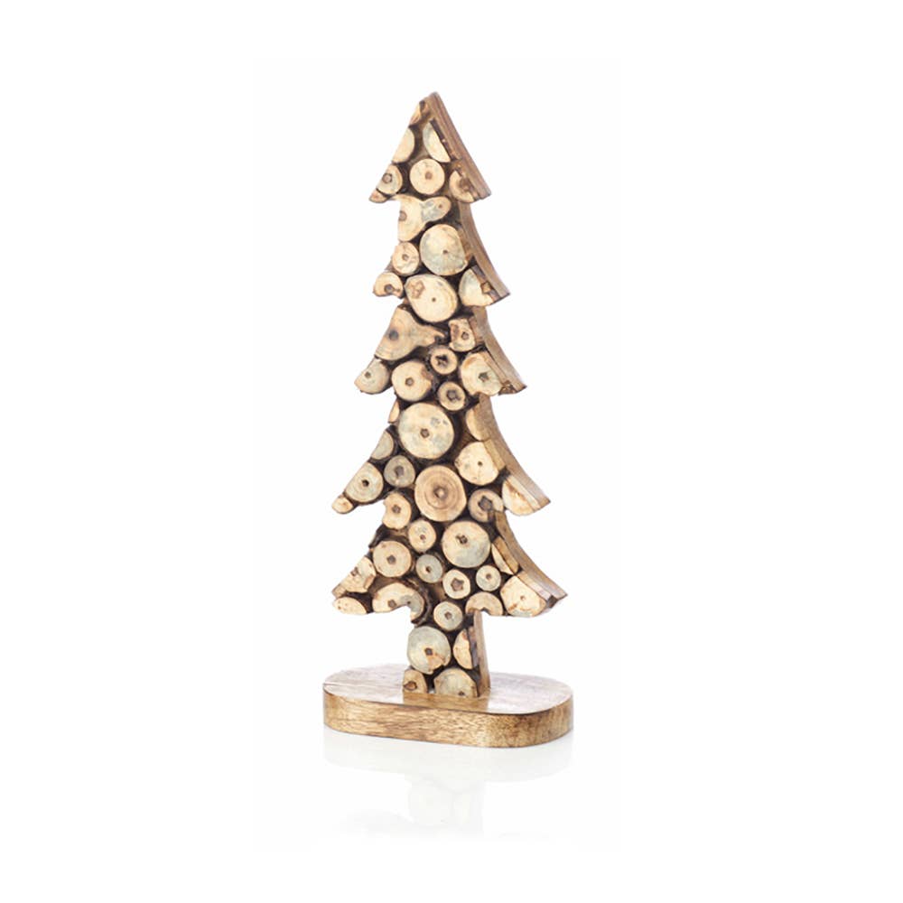 Bring artisan beauty to your holiday décor with this handcrafted set of three wooden Christmas trees. Each tree is carved from sustainable sengon wood and hand-batiked by fair trade artisans in Indonesia, featuring delicate, nature-inspired patterns that make every piece one of a kind. With smooth natural wood tones and sturdy square bases, these trees display beautifully on a mantel, tabletop, or shelf. Perfect for adding a touch of rustic elegance to your Christmas decorations, this wooden tree set pairs beautifully with our Batik Wooden Reindeer for a coordinated artisan holiday look that celebrates craftsmanship and sustainability. Dimensions: Sm: 9"h; Med: 13"h; Lg: 16 1/2"h. Keywords: Christmas décor, holiday décor, holiday decorations, Christmas tree decorations, Christmas decorations.