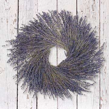 Handcrafted in our California studio, this 18" wreath is made of dried lavender that is sourced directly from the fields of Provence, France where growing, harvesting and drying lavender is an age old tradition. - Please note that some lavender buds will shed/fall off during transportation. We build the wreaths to be very full so that the finished product can afford the shedding during transportation and will still look good once unpacked. - Please note that our wreaths are handmade of natural materials that can be damaged if exposed to rain, snow, or heavy wind. We recommend keeping our wreaths inside or on a covered porch to protect the wreath. - Made of natural dried lavender - Handcrafted in California - 18" diameter x 4" depth - Ships separately from our other items in a store-able wreath box.