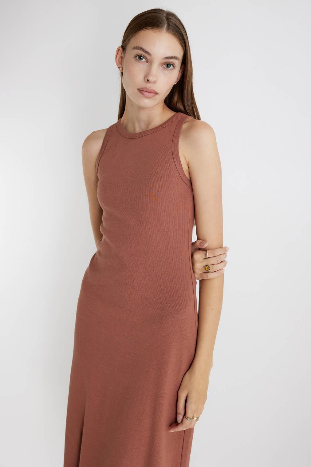 A romantic choice for warmer weather or for layering during the cooler nights, The Esther Dress is a sleeveless, maxi dress that is cut from a lightweight, sheer chiffon fabrication. It's detailed with a scoop neck tank upper and a tiered skirt. It has side drawstrings for adjustability, hidden side pockets and partial inner lining.