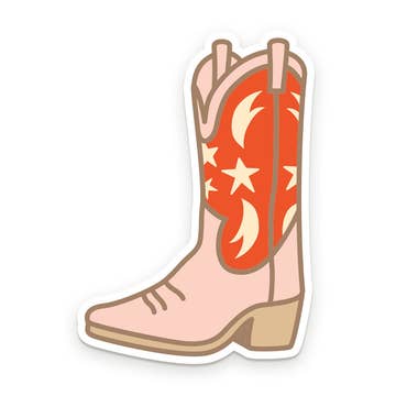 Size 2.46" x 3.92" Image Description: a vinyl sticker with the motif of a pair of red cowboy boots with gold embellishments, white daisies with leaves and stems stick out of each boot, the entire motif is outlined in pink All images, products and designs © Noteworthy Paper & Press