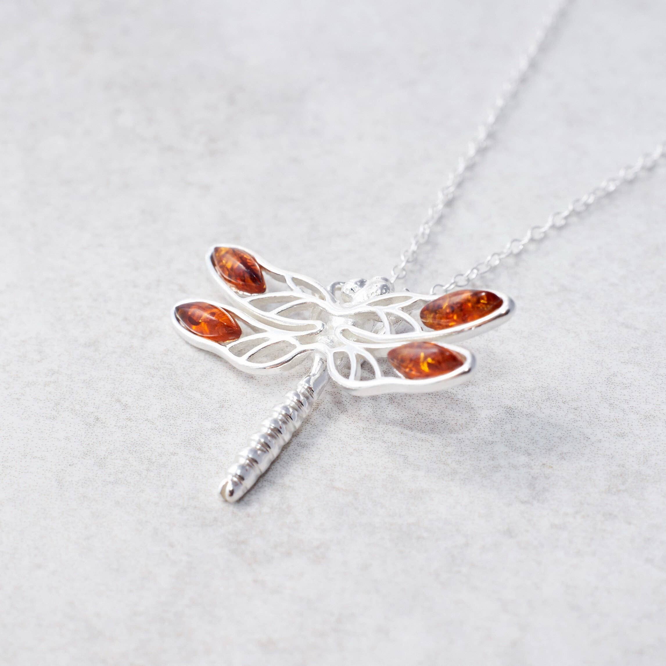 Natural Baltic amber and sterling silver dragonfly earrings Featuring a sterling silver dragonfly decorated with honey Baltic amber cabochons assembled in a solid sterling silver outline. These lovely dragonfly earrings are made of Baltic amber stones in classic honey colour and sterling silver (.925) elements. These earrings have been made with attention to details. The flying dragonfly features the large multifaceted eyes, silver elongated body and two pairs of wings decorated with Baltic amber cabochons. The drop length of the earrings is 3cm (1.18") and the dragonfly is 1.8cm (0.7") long and 1.7cm (0.67") wide.