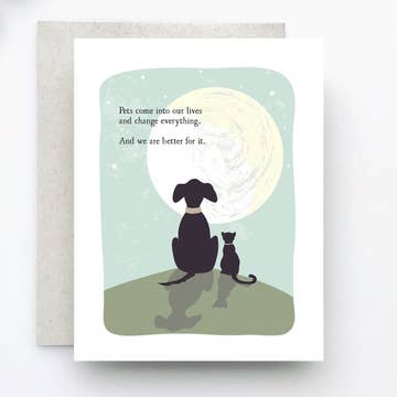 A lovely message to congratulate a new pet parent, or to comfort one in a time of loss. Message | Pets come into our lives and change everything. And we are better for it. Interior | blank Envelope | 100% recycled beach kraft Format | A2, 4.25" x 5.5" Packaging | cello sleeve Professionally printed on premium heavyweight paper