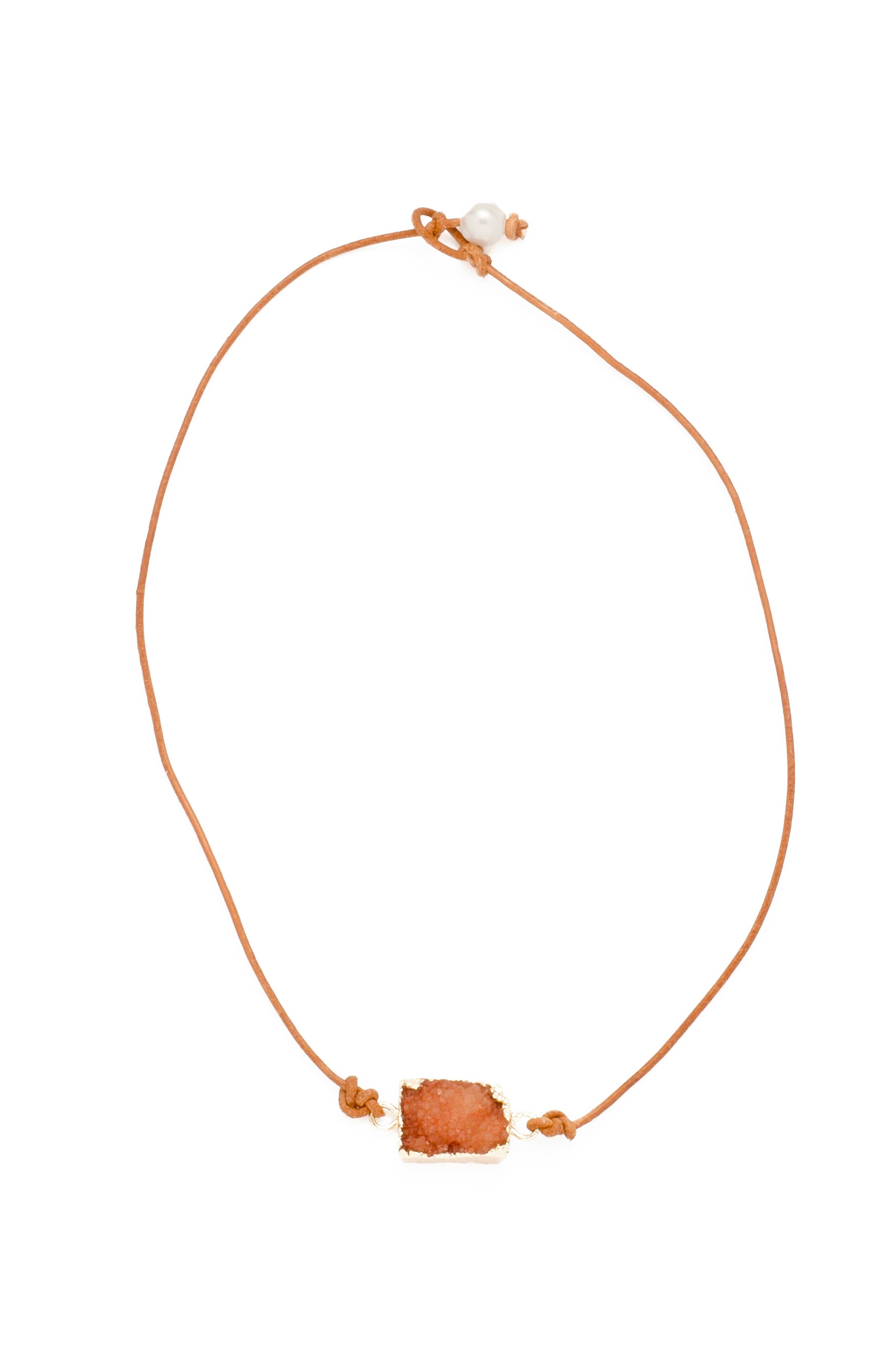 Beautiful druzy stone secured on a leather chord Necklace closes with a pearl and hoop closure. 8"