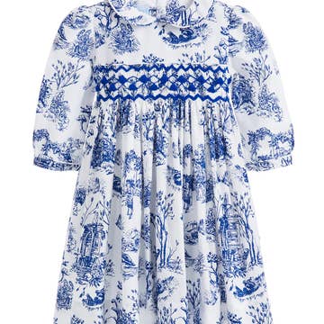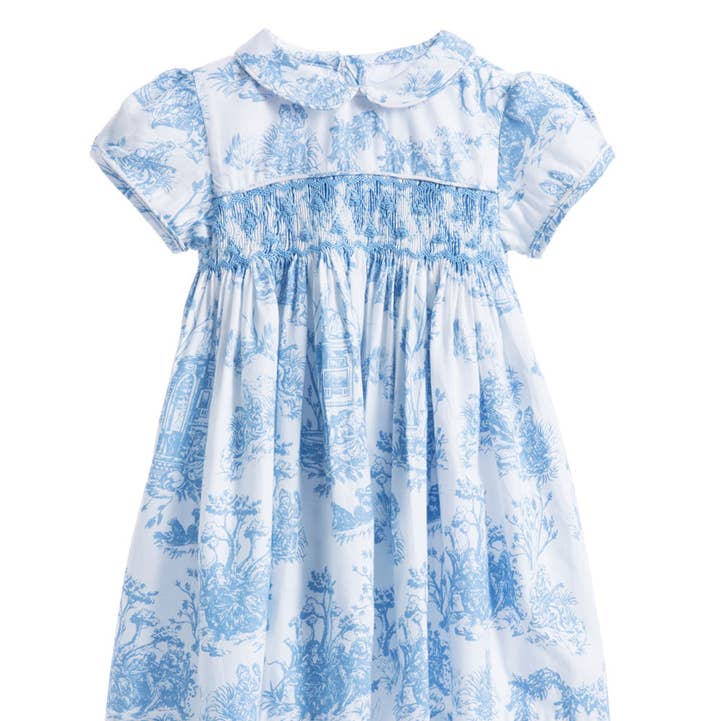 Our newest addition to our favourite Toile de Jouy patterns, Giselle features a blue and cream colour combination on 100% organic cotton, and is the perfect dress for a girl who knows her own style, and for the changing seasons.  The Giselle features a classic peter pan collar and elegant long sleeves that end in a narrow cuff. The Giselle is finished with Annafie’s trademark hand smocking on the chest, and a level of detail that makes it one of the most luxurious items in the catalogue.  Our dresses are lined in cotton to create a perfect flare for twirling and dancing like everybody’s watching. The Giselle has fabric covered buttons that fasten at the back and an attached sash tie at the waist (12 months+).   -100% fine organic cotton -Machine washable at 30°C -Traditional hand smocking and embroidery - Available in sizes 3 months to 8 years -Smocking width increases with dress size