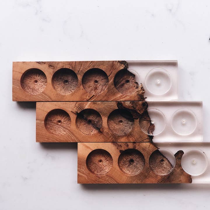 The resin is transparent allowing you to see anything you place it on, but also the amazing detail and clarity of the individual maple burls. Details: Hard maple burl & rose translucent resin. Ecopoxy resin used for earth friendliness and safety. 14" long x 2" wide x .5" high. Finished a polyurethane for a gloss finish. Branded with kindred essentials logo.