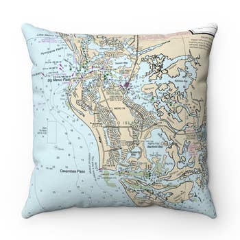 Ox Bow Decor has taken nautical maps to a new level. Coastlines of Massachusetts, New Hampshire, Maine, Connecticut, Rhode Island, New York and New Jersey are now in Yachts, Scallop Shells and Vintage Bathing Suits. Other coastal locations are available upon request. Pillows have hidden zippers in the back and linen covers come with feather down fills and Sunbrella covers come with faux down poly fills.
