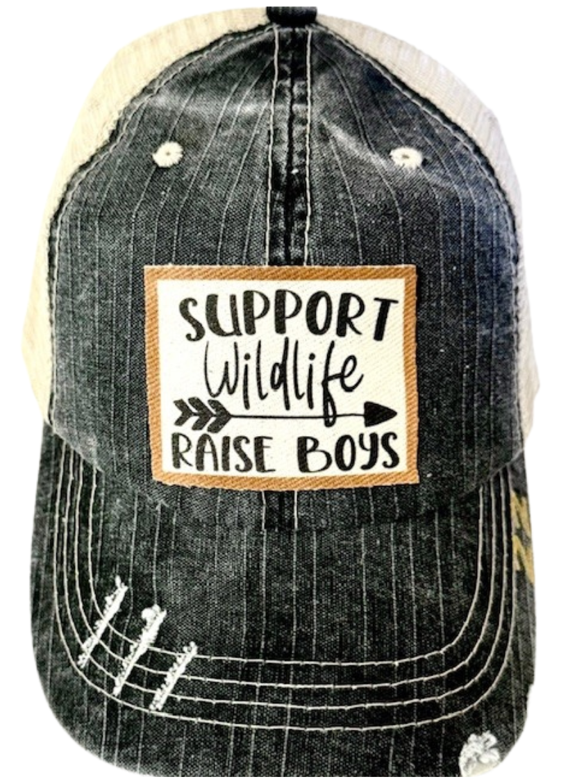 Vintage distressed trucker cap "Mom Of Boys" Color: Black distressed Material: cotton/polyester blend, mesh back. Size: one size fits most, with an adjustable snap back strap. Unisex cap.