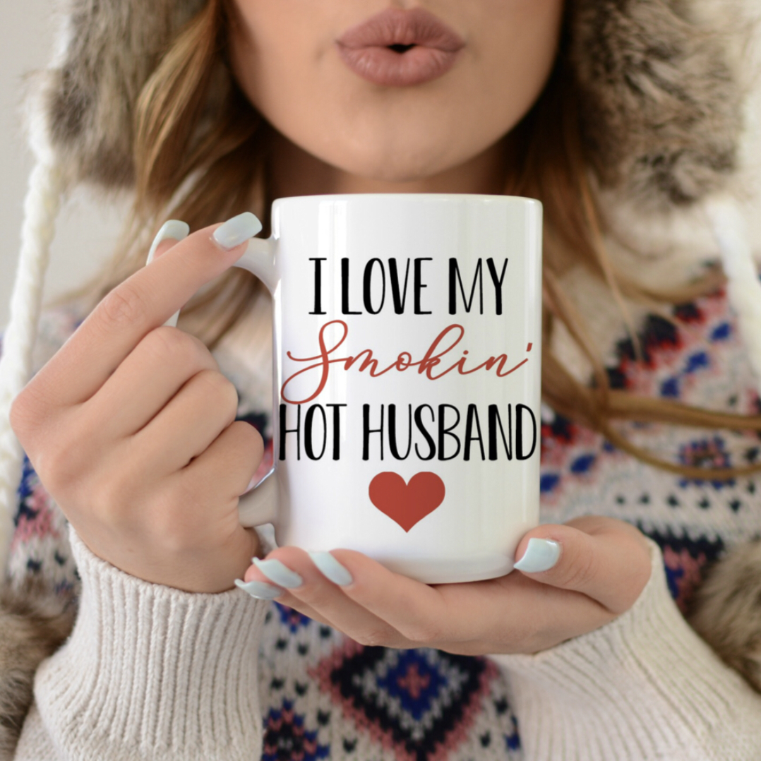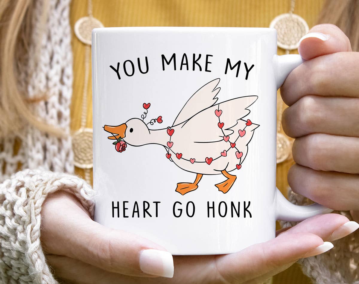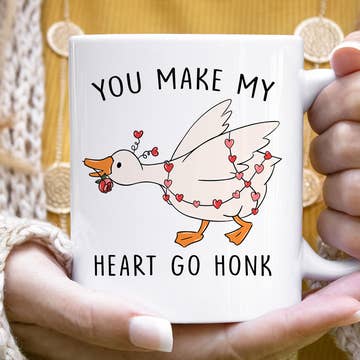 A stoneware coffee mug lending a double-sided, distressed "Love You A Bushel And A Peck And A Hug Around The Neck" sentiment with slatted wooden background print and heart design. Microwave, oven, dishwasher, and food safe. Holds 20 oz.