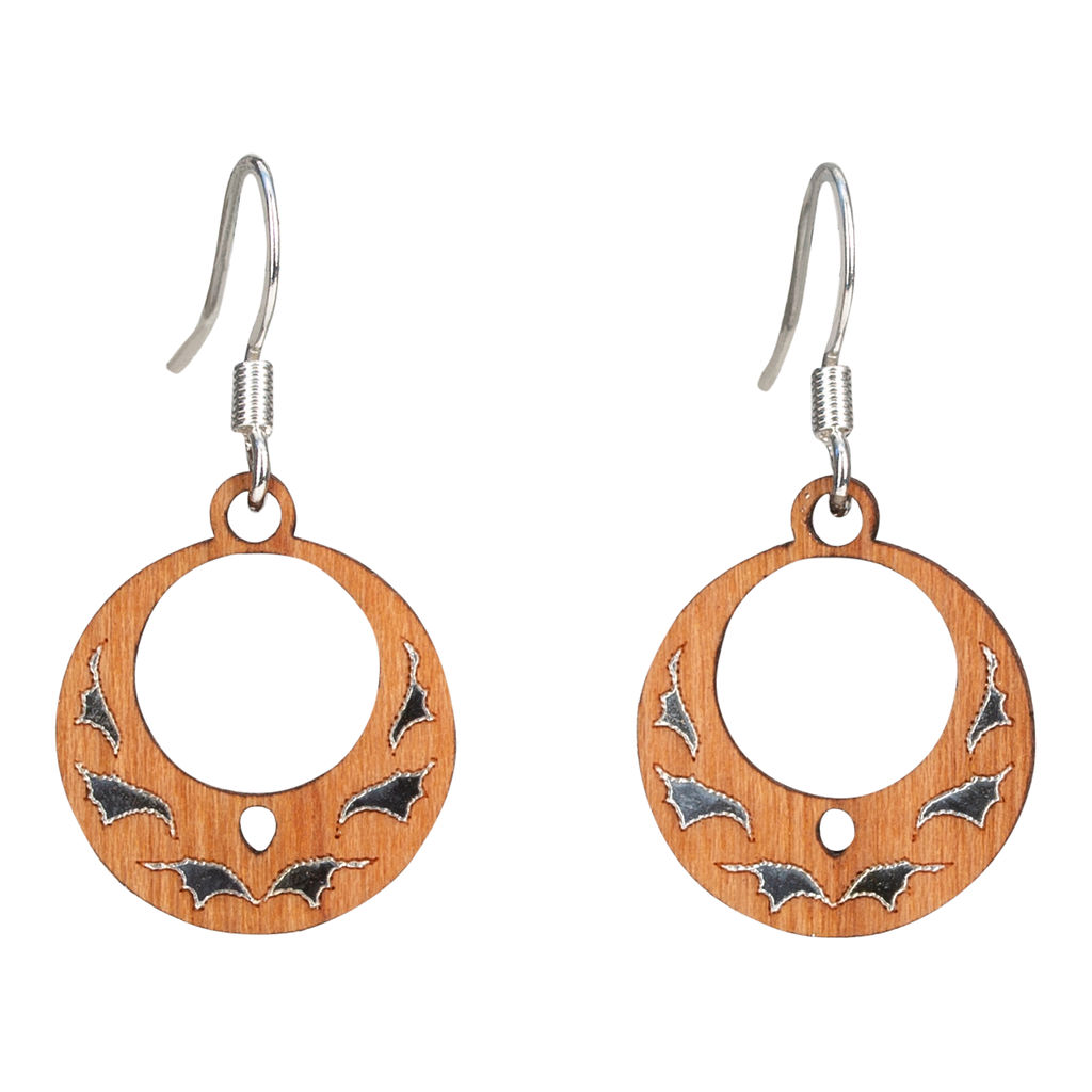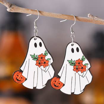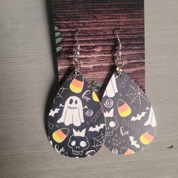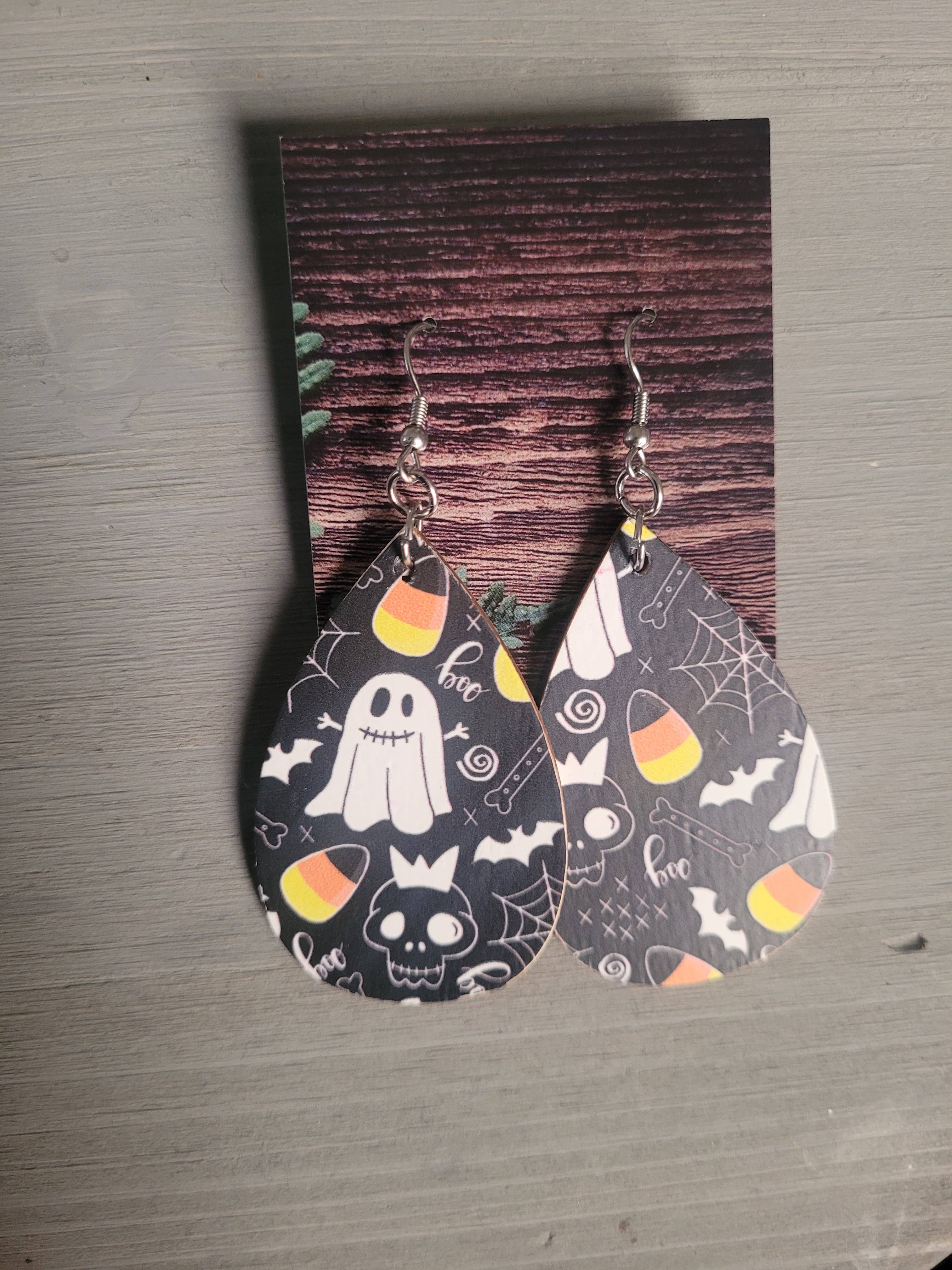 Ghost Bourbon Barrel Boo Dangle Earrings. Made from reclaimed Kentucky Bourbon Barrels. Halloween dangle earrings. Starting with a unique idea We make our earrings from 100% reclaimed Kentucky Bourbon Barrels. Laser engraved using current technology, we carefully craft each pair of earrings to make them each their own. Hand-paintedproducts and sealed. We add the finishing touches of stainless steel hypoallergenic hooks with handcrafted care. We want our customers to be pleased with their product while providing these pieces at an affordable price. Our Ghost Bourbon BooHalloween drop earrings are lightweight and a perfect accessory for the fall season with the added touch of Kentucky Bourbon Oak. **Please note that all wood grain appearance varies** Sizes are approximately 1/8” in width and 2” drop length. Material: Wood