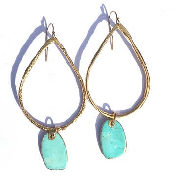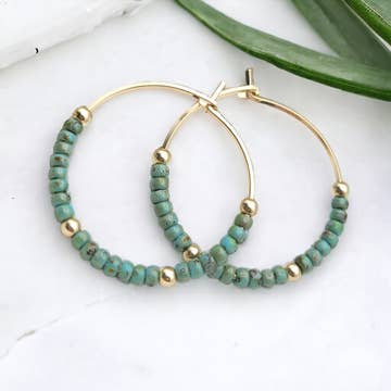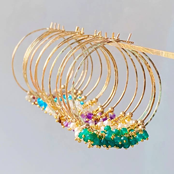 These stunning statement earrings are the perfect addition to your spring and summer wardrobe. They are hand forged from 14kt gold filled wire and hammered with a dappled texture to catch the light. They feature 3mm genuine faceted amazonite stones that are hand strung with 14kt gold filled wire around the hoop. They are very lightweight and slide easily into the ear and self hook at the back of the ear. They are 1 1/2” in diameter. Each one will be slightly unique.