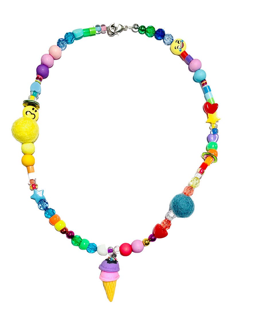 Wooden beaded necklace adorned with multi colored pom poms. This can be paired with so many different things over and over again! Would be so cute as a stocking stuffer for xmas in a Easter Basket or as a birthday gift!