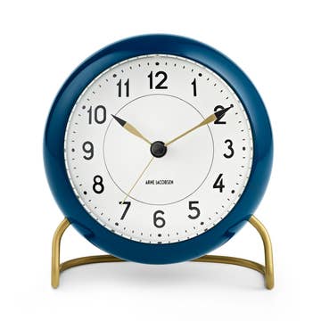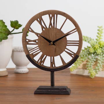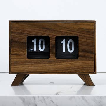 New Triangles Mantel Clock (Larger and a more exciting clock face). Studio crafted from certified sustainable Appalachian cherry wood with black round feet and a black and aluminum face and clock hands. You can easily read the time across the room. Warm Modern design can fit comfortably on a mantel or on a desk.