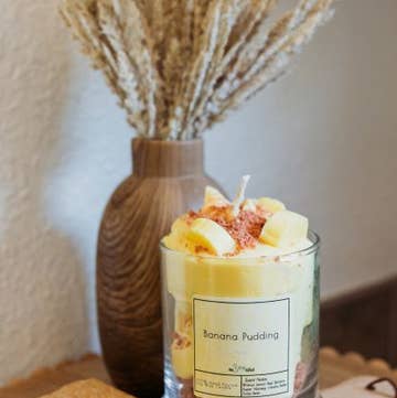 12 oz Banana Pudding candle Topped with wax banana slices and vanilla wafer cookies Banana pudding scented The wax is a blend of vegetable and paraffin waxes.