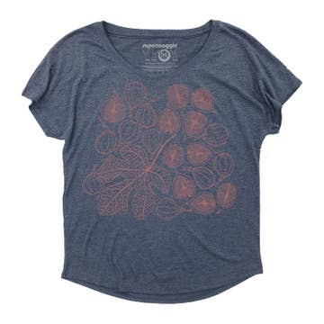 Shirt color: rouge (a pinkish red). Ink colors are deep plum and dark green. 55% cotton, 45% polyester. Inspired by our love of root veggies and farmer's markets, the humble red beet gets a lovely Art Nouveau makeover in our newest design. It's almost too pretty to eat. Printed on a cap sleeve jersey knit top. This comfortable style has the casual fit of a boxy top, but the super soft mid-weight fabric gives it a luxurious feel and a feminine drape. Model shown is 5'8, size 8 (36B bust), and is wearing a MEDIUM in this style. A truly accommodating style for a variety of body types, this roomy top has a similar fit to our popular rolled cuff tees. However, because it has a true boxy cut, it does run a bit larger. So we generally recommend sizing down. Currently available in sizes S-XL. Due to limited quantities, 2XL available by request only.