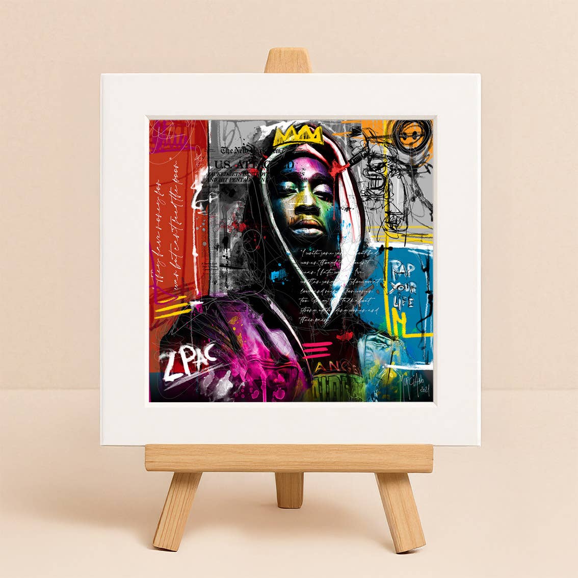 The Versailles collection pays tribute to revisited classical art. Here, a white mat of 20×20 cm highlights a central work in a 15×15 cm format. The depth effect achieved creates an elegant and airy framing. The whole is enhanced with high-definition printing in intense and durable colors. Outer dimensions: 20 x 20 cm Image size: 15 x 15 cm Printing process: Sublimation Included support: Mini wooden easel