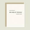 Our Do Great Things card is perfect for the new graduate. A2 size (4 1/4" x 5 1/2" folded) • blank interior • letterpress printed on heavyweight FSC cardstock • latte envelope • packaged in a clear sleeve Hand printed sustainable luxury greeting cards for the graduate grad congratulations