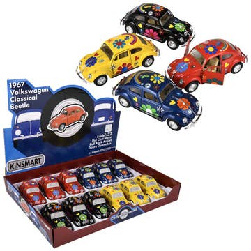 • Volkswagen-inspired die-cast that features pull-back for hard surfaces and openable doors • Assorted colors • Sold by the display • 12 pieces per display • Ages 3+
