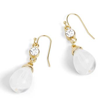 These sparkling clear quartz earrings are a chic, versatile pair designed to catch the light with every movement. Large natural crystal quartz teardrop gemstones create an elevated look, while delicate wire wrapping adds refined handcrafted detail. Hand-formed ear wires create a sleek look and are comfortable wear. A luminous dangle earring that transitions effortlessly from everyday styling to special occasions. Details: *Sterling Silver or 14kt Gold Fill *Natural Crystal Quartz (12-14mm) *Stones have natural inclusions *2 inches *Handcrafted in Connecticut *Tagged or carded for retail display *Faire Insider Free Shipping Suggested Retailers: *Coastal and destination gift shops *Laid-back luxury women’s apparel boutiques *Artisan gift shops *Bridal Boutiques Carrie Whelan Designs is a woman-owned studio creating delicate, limited-edition jewelry with pearls and gemstones. For questions or a custom order contact the studio at 203.626.2171 or info@carriewhelandesigns.com