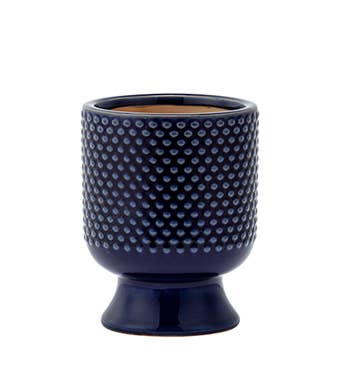 An eye-conic graphic, the bright bold and alert eye on this cobalt blue glazed ceramic cachepot creates a stunning talisman to hold a 4” drop in pot.