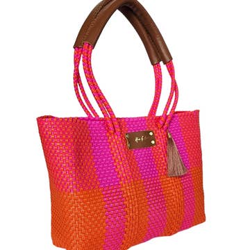 Dimension: 17" x 14" x 8.5" 32" leather handle. Zip top. 2 open pockets on inside with zip pocket opposite. Leather bottom. Made from 100% cotton hand-woven dhurrie rug. Magenta cotton lining. Gold leather detail.