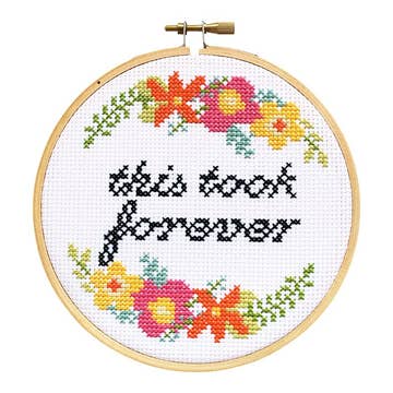 This kit includes floss, a 5 inch hoop, needle, and instructions. The design is perfect for someone who wants to try embroidery for the first time by learning a few key stitches: chain and satin stitch
