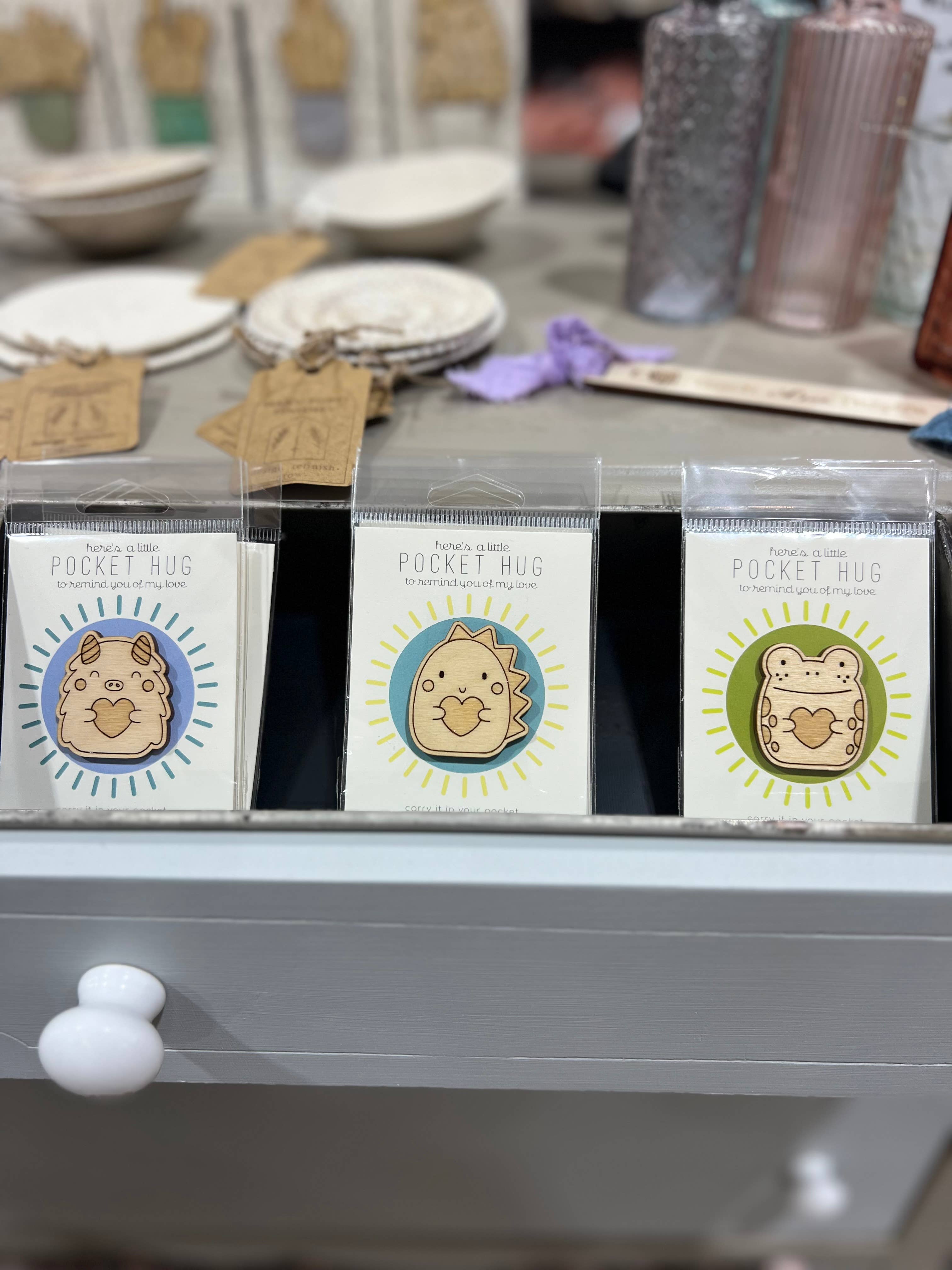 because everyone could use a little extra comfort — our wooden pocket hugs are designed to remind someone special that they’re loved and never alone. each engraved animal token features an original illustration and a smooth hand-finished feel, making it a small but meaningful gesture of encouragement. tuck one into a card, gift box, or pocket for a thoughtful reminder that lasts long after the moment. a best-selling, giftable item for boutiques, bookshops, and stationery stores. perfect for teacher gifts, stocking stuffers, care packages, or friendship tokens. crafted from 1/8" sturdy baltic birch and measuring approximately approximately 1.2 inches wide by 1.6 inches tall (rabbit is taller). each token is locally engraved and mounted on a 2.8 x 4 inch backing card and packaged in a cello hanging sleeve for easy retail display. designed collaboratively by a mom and her daughter, at home, in virginia. locally laser cut.