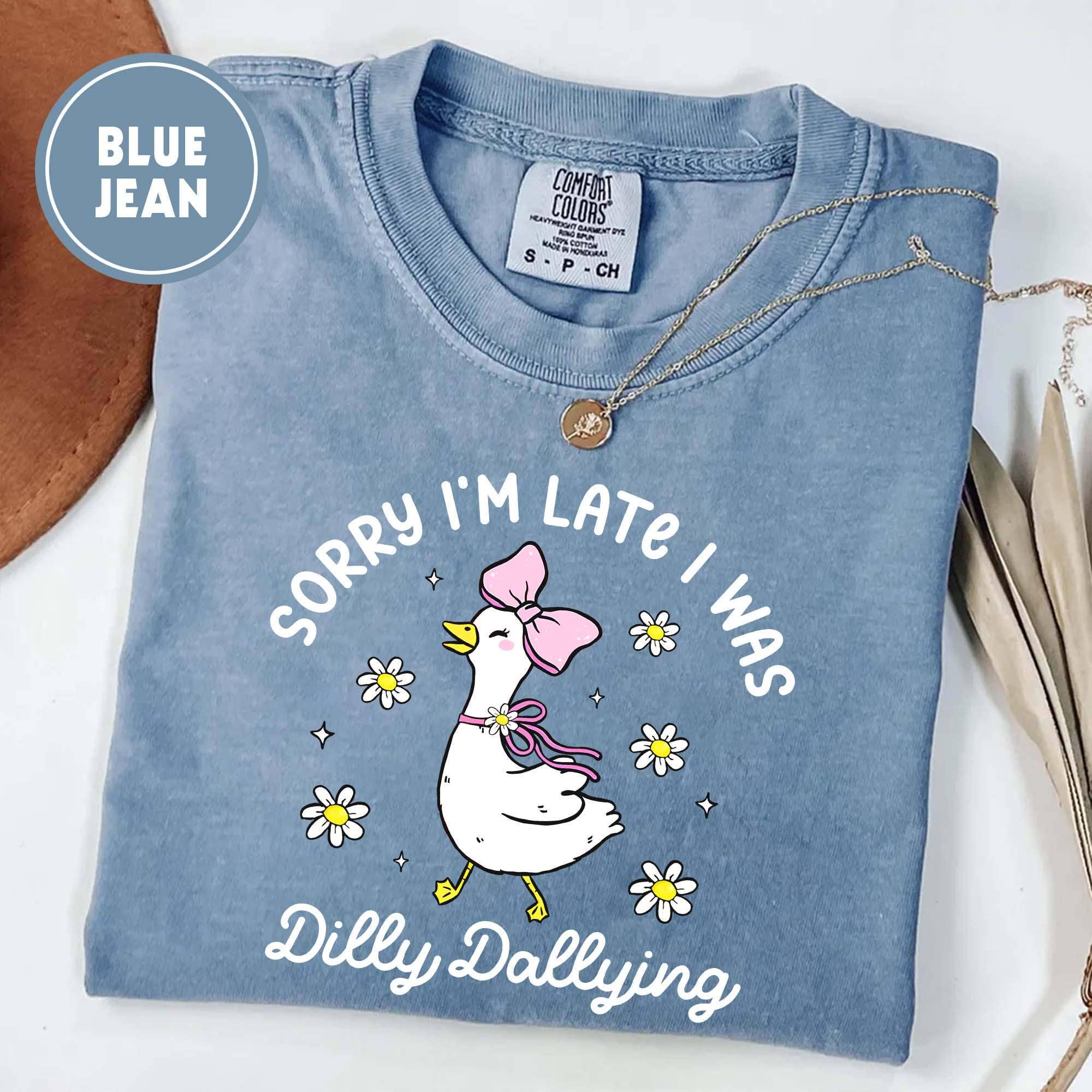 Sorry I'm Late I Was Dilly Dallying Shirt, Goose Sweatshirt Unisex T-Shirt (Gildan 5000) - 100% cotton - Medium fabric (5.3 oz/yd² (180 g/m²)) - Size available: S, M, L, XL, 2XL, 3XL, 4XL, 5XL Unisex Sweatshirt (Gildan 18000) - 50% cotton, 50% polyester - Medium-heavy fabric (8.0 oz/yd² (271.25 g/m²)) - Size available: S, M, L, XL, 2XL, 3XL We use the direct to garment printing technique for a vibrant and long-lasting print. For more information, please feel free to contact us.