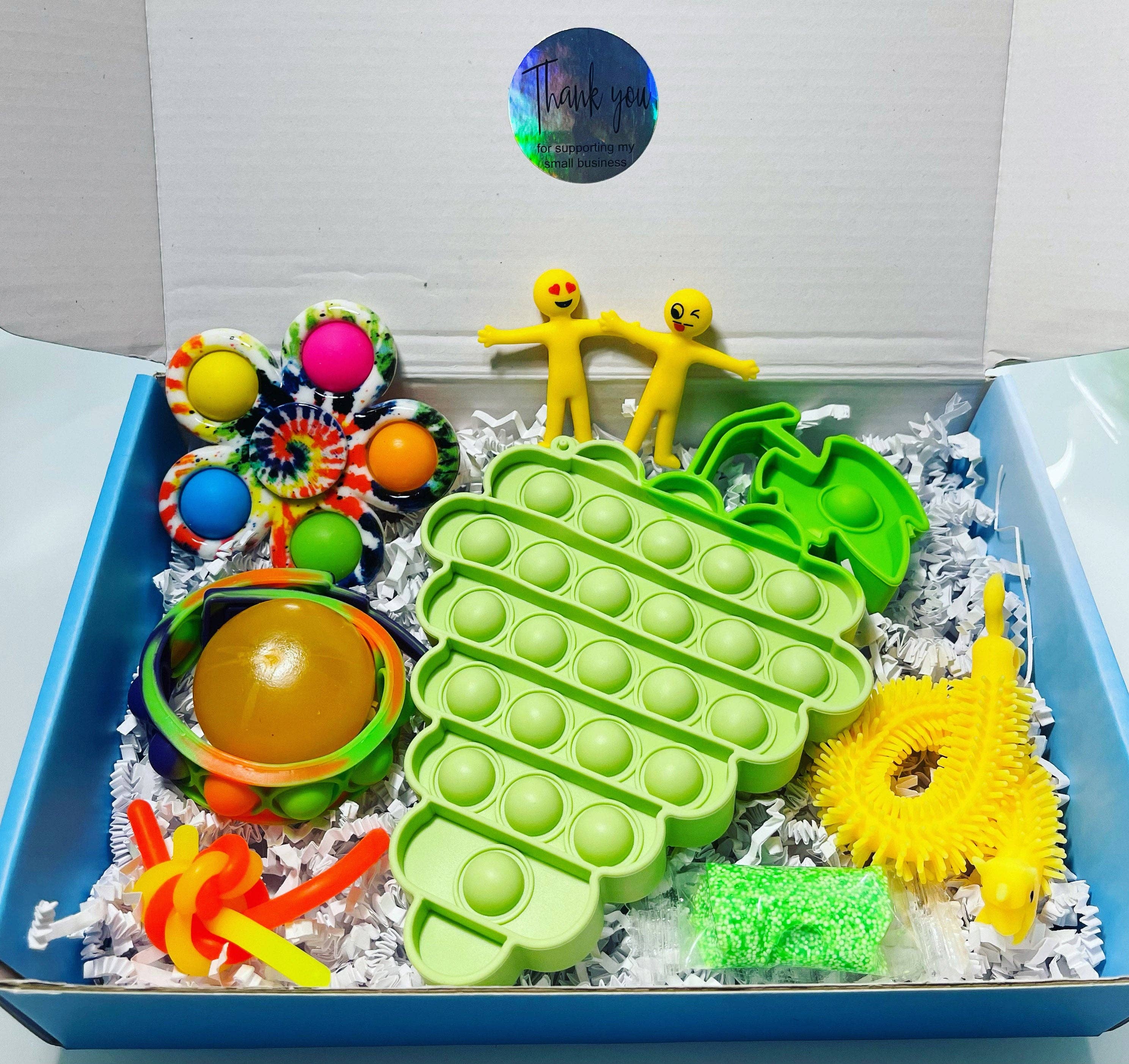 This box is filled with some of our favorite fidgets from pops to stretch to spin to shape to squish. This box fulfills so many sensory needs! Don’t miss out on owning this box This fidget box includes: an assortment of fidgets to theme of colorful shake. The picture is an example of what you’ll receive. Each box will be slightly different as they are each made uniquely and individually but will have the same quantity and quality *small items create a choking hazard. Supervise children with use.