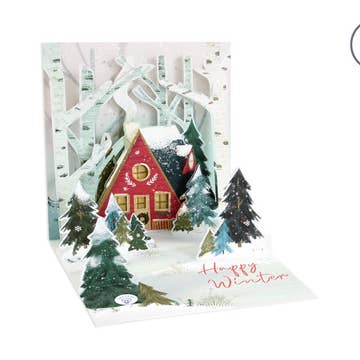 Our Pure Alchemy Collection features cheeky salutations and pop-ups mixed with intricate laser-cutting. A pair of deer pause quietly within an idyllic winter landscape. Front copy: happy winter Inside copy: blank 4″ x 8″ Printed in full color and finished with gold foil & Pantone ink. Warm white envelope with scalloped edge flap
