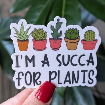 Quantity: 5 identical stickers come in each wholesale pack. This allows you to not only pick multiple designs without breaking the bank, but it also gives you the opportunity to test different styles out in small quantities to see if your customer's enjoy them before ordering larger quantities. Size: 2.6 inches high, 2.4 inches wide Quality: All stickers are designed by Beautiful Mind Design and printed by a third-party company to provide you with a top-quality product. This sticker is vinyl. It is dishwasher safe, waterproof and weatherproof. It would be great for decorating your water bottle, laptop, skateboard or cell phone and is safe to put onto your car. Tags: Plant Lady, Plant Mom, Plant Dad, Plant Addict, Houseplant, Plant Obsessed, Green Thumb, I’m Sexy Cause I Grow It, Succulents, LMFAO