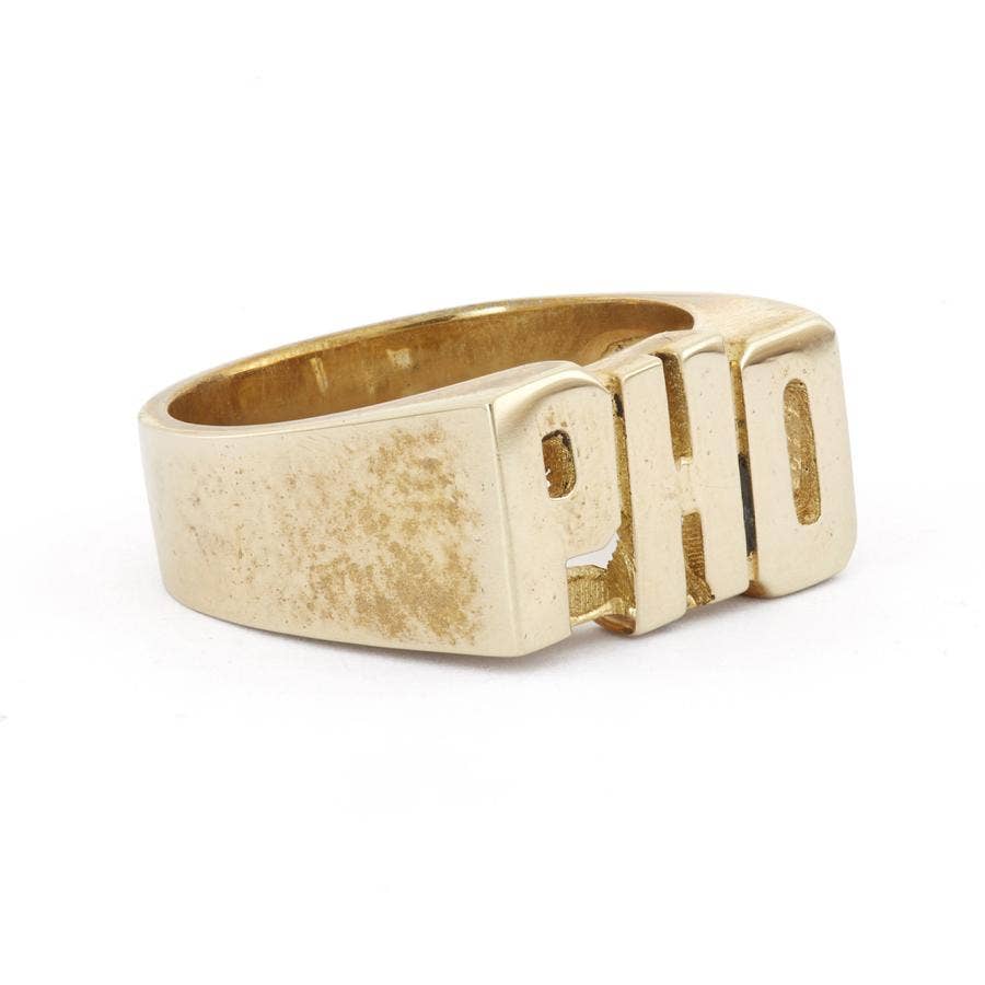 Snash Jewelry nameplate rings are available in sizes 5-9. Brass rings are uncoated, allowing for customer re-polishing. Avoiding water, heavy lotions, chlorine, etc., will prolong the original polished shine. Cleaning the ring with a jewelry polishing cloth will restore shine if tarnish occurs.