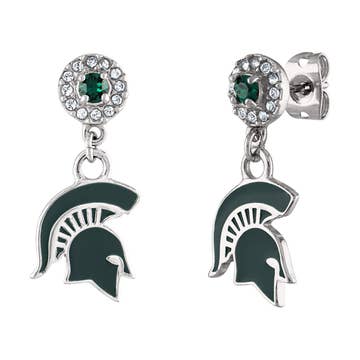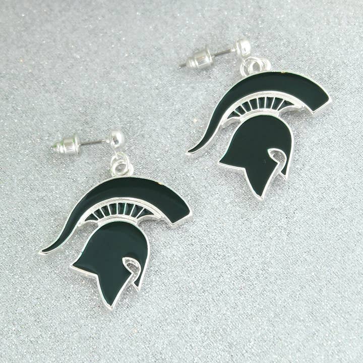 Silver plated post earrings with green enamel featuring the “Go Spartans” slogan. This is an officially licensed product.