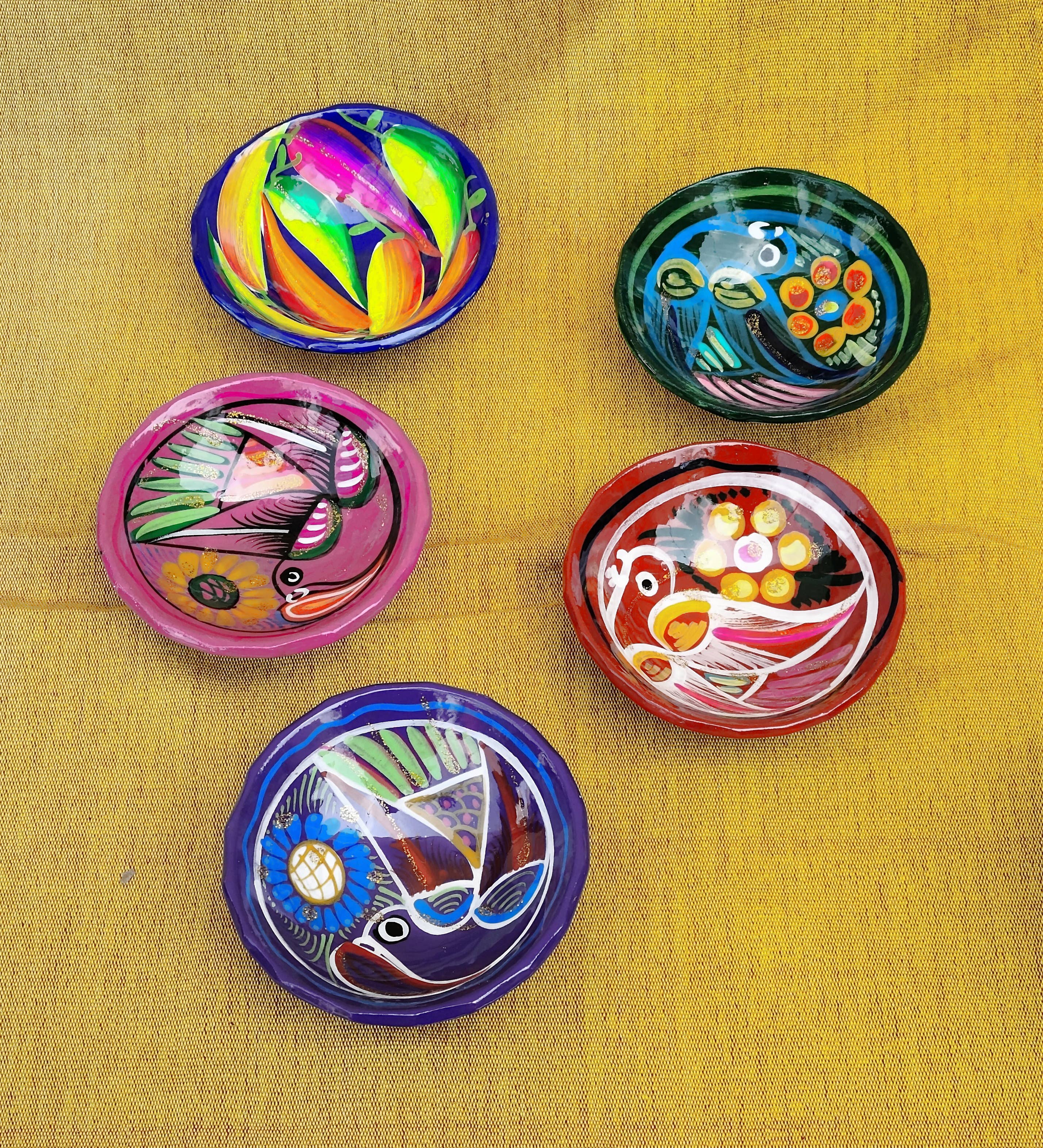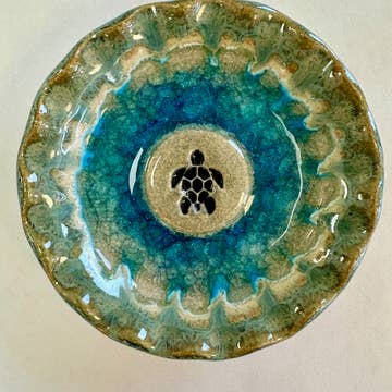 This small bowl features our Koi design - a great gift for nature lovers, yoga enthusiasts, and zen seekers. * Sea blue glass, with a light teal and orange print * About 5" across, 2" high * Slightly matte interior, shiny exterior * Dishwasher safe * Handmade Bowls are screen printed with glass enamels, then fused in a kiln in multiple firings. Small bowls are great for fruit, olive or nut bowls, salsas and dips, hold small trinkets and make cute decorative accents. Designs are permanently fused into the glass.