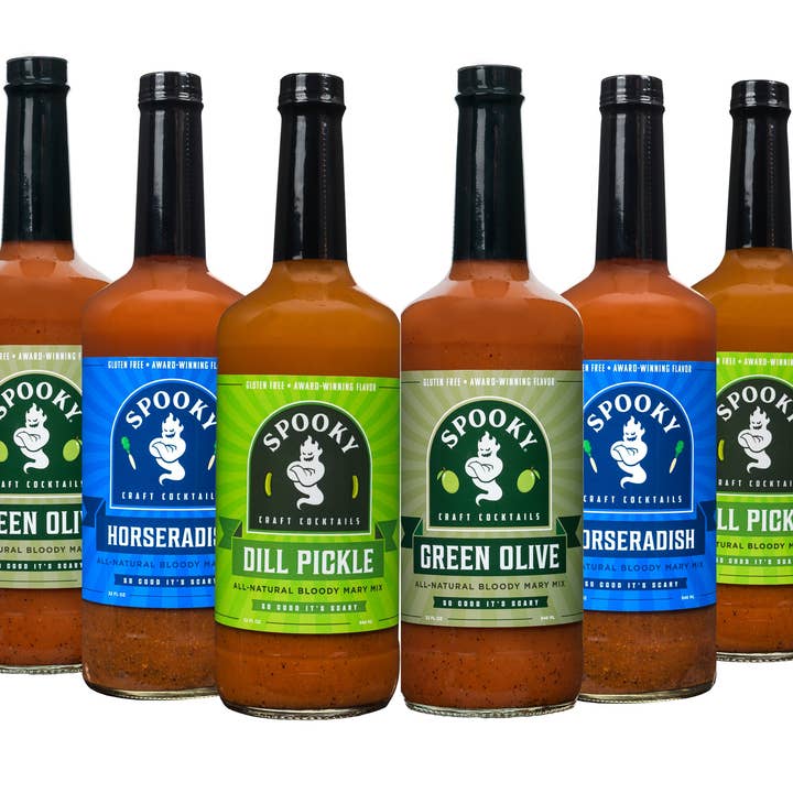 SPOOKY Bloody Mary Combo Set - 3 each... Dill Pickle & Green Olive 2 Gold Medal Winning Recipes in 1 set, sure to excite any Bloody Mary lover! DILL PICKLE: All Natural & Perfectly Balanced with Real Dill Pickle Brine, a touch of Horseradish, and more than 20 other awesome natural ingredients..... Zesty and Delicious with a mild kick! GREEN OLIVE: New & Unique - the perfect combination of olive brine and a tantalizing blend of spices combined in perfect balance. All Natural with Real Olive Brine, a touch of Horseradish, and more than 20 other awesome natural ingredients. Perfect for Mocktails too, delivering awesome flavor without spirits. NO - Gluten, Shellfish, Preservatives, High Fructose Corn Syrup, MSG, or Artificial Flavors. 32oz. Glass bottles. Contains no alcohol.
