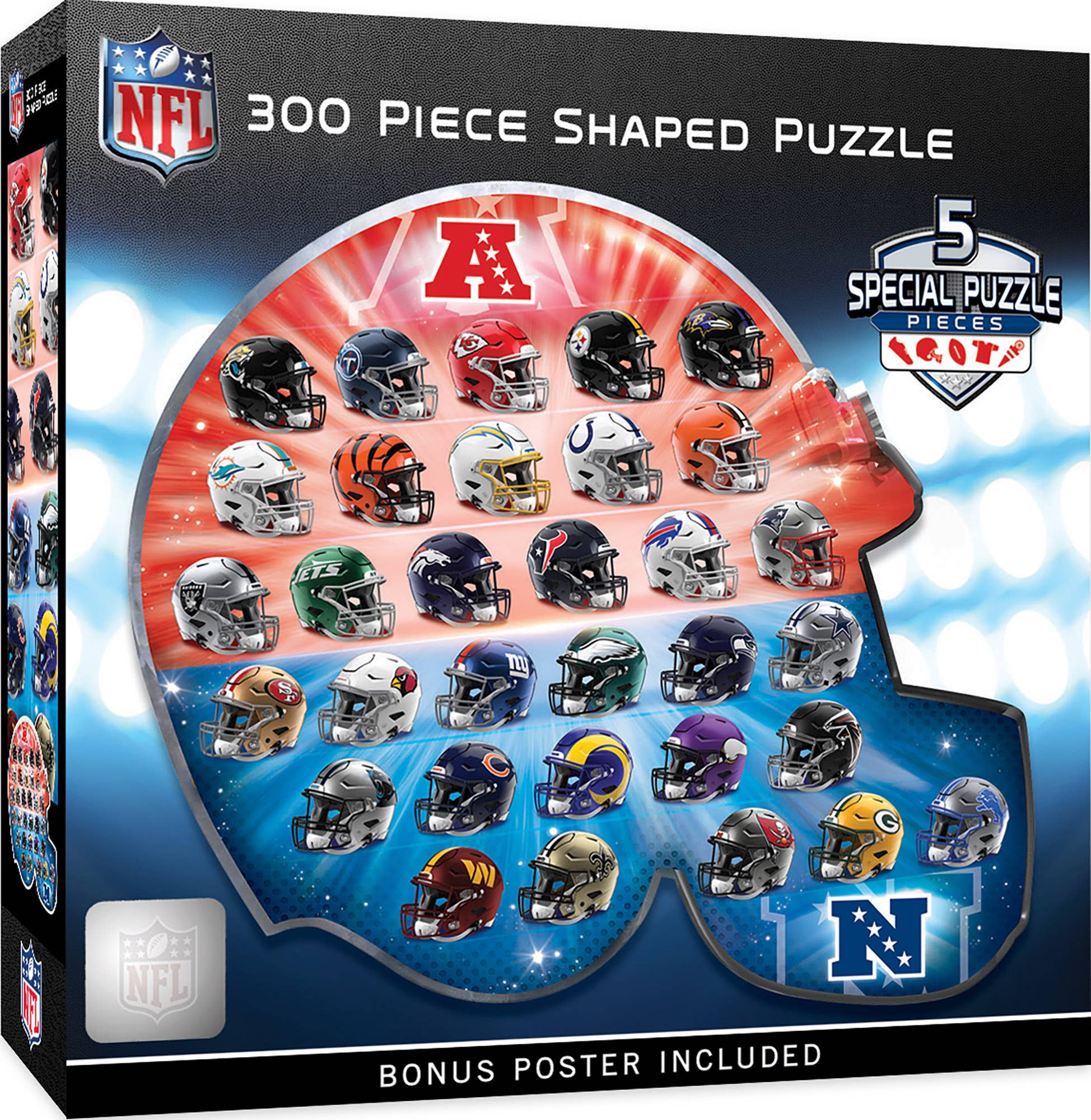 SKU: NFL1080.02 Made in China Large Puzzle Piece: No Piece Count: 500 - 999 pieces Recommended Age: 14+ years Weight: 453.59 g (1 lb) Dimensions: 20.3 x 20.3 x 5.1 cm (8 x 8 x 2 in) UPC: 705988017100